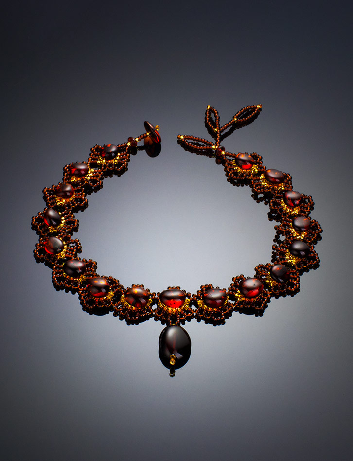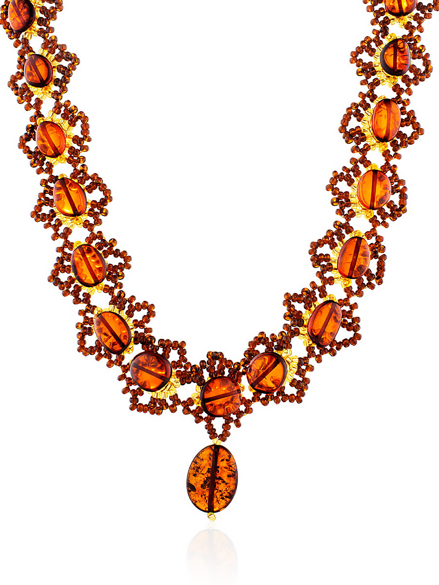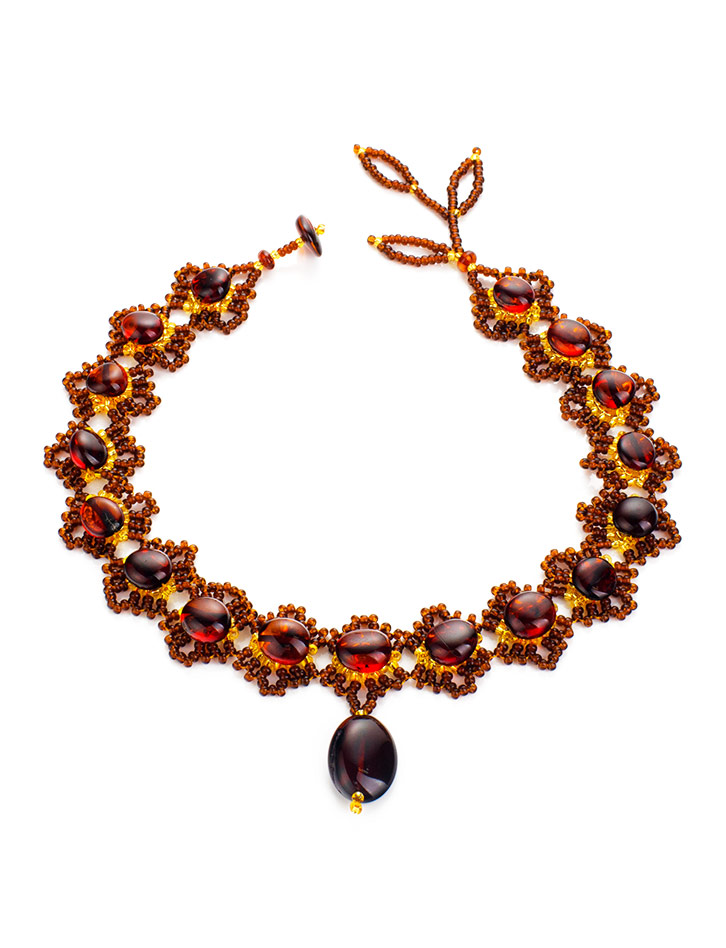 Нарядный плетёный чокер «Лукоморье» из бисера и натурального янтаря