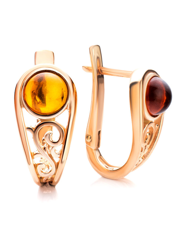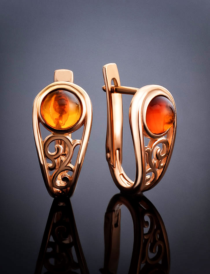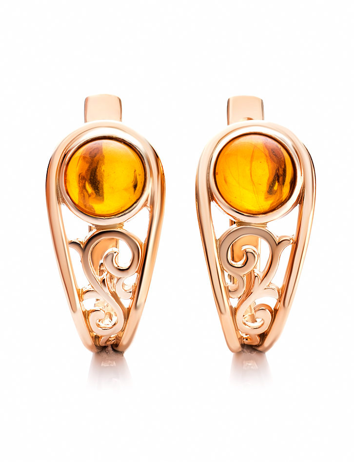 Небольшие изящные серьги в позолоте с коньячным янтарём «Шахерезада»