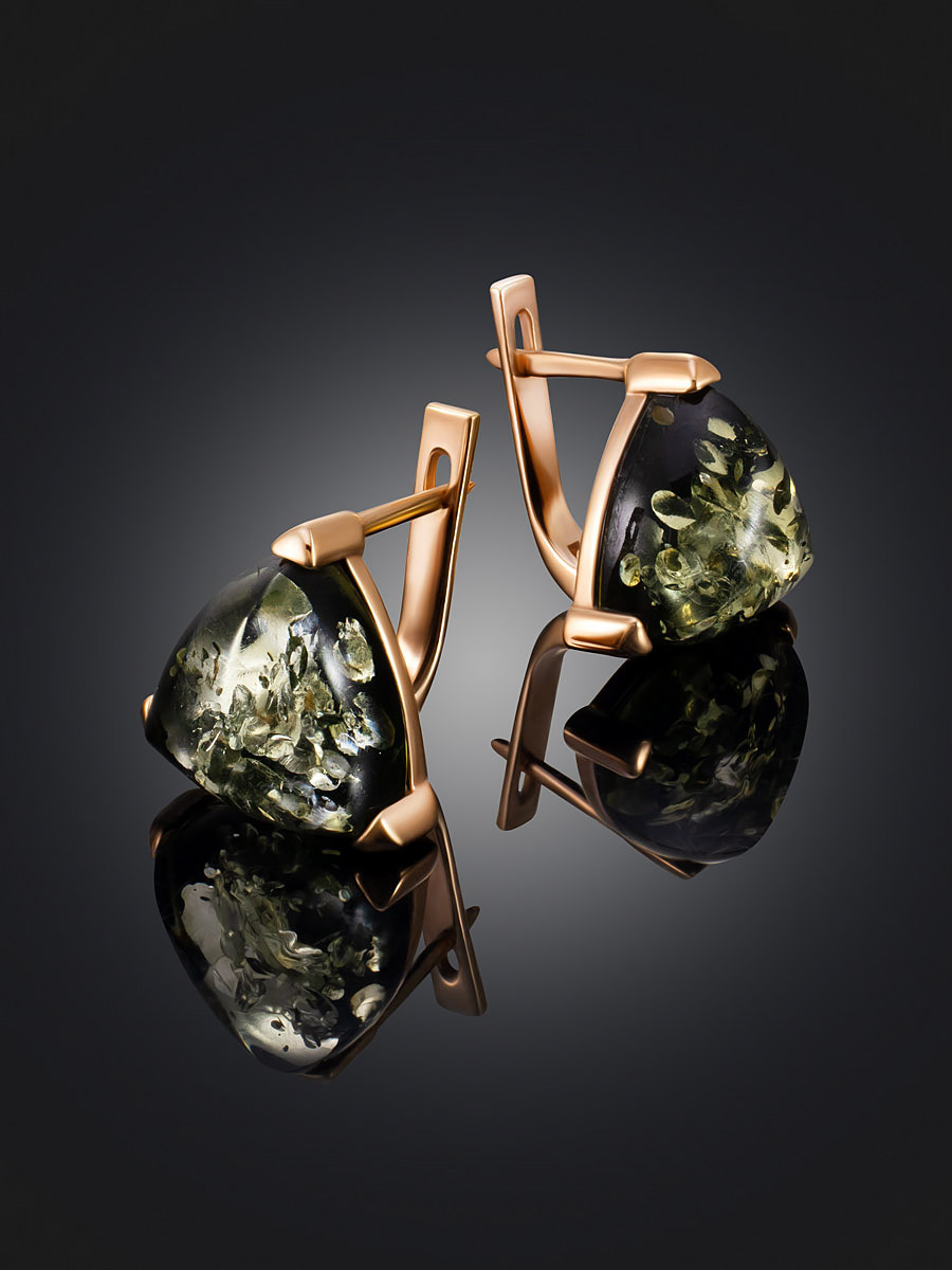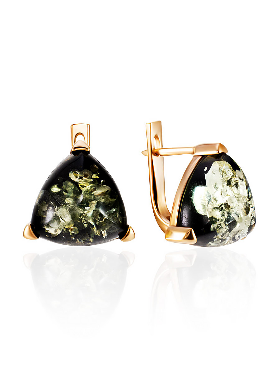Небольшие позолоченные серьги со вставками из зелёного янтаря «Треугольник»