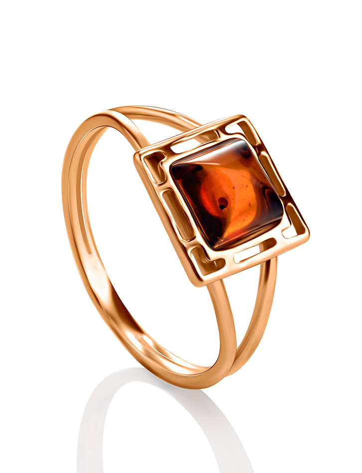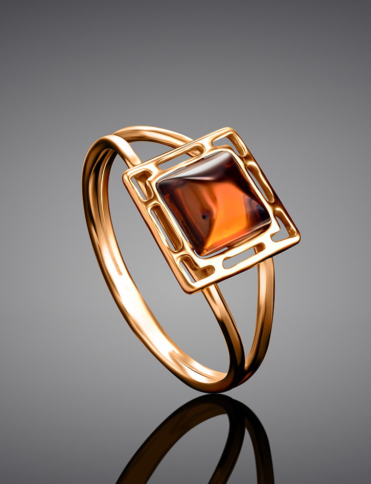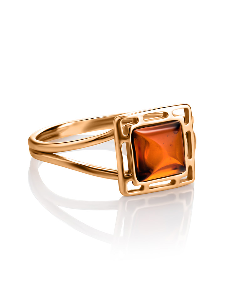 Небольшое кольцо из серебра в позолоте и янтаря ярко-коньячного цвета «Итака»
