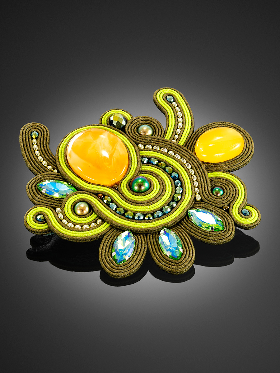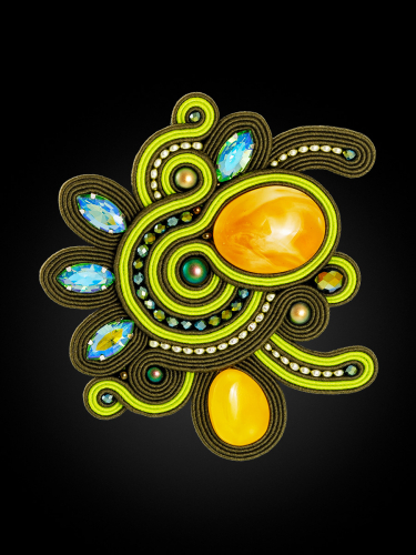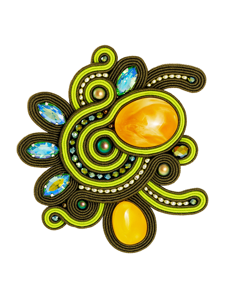 Необычная плетёная брошь, украшенная натуральным янтарём и кристаллами «Индия»