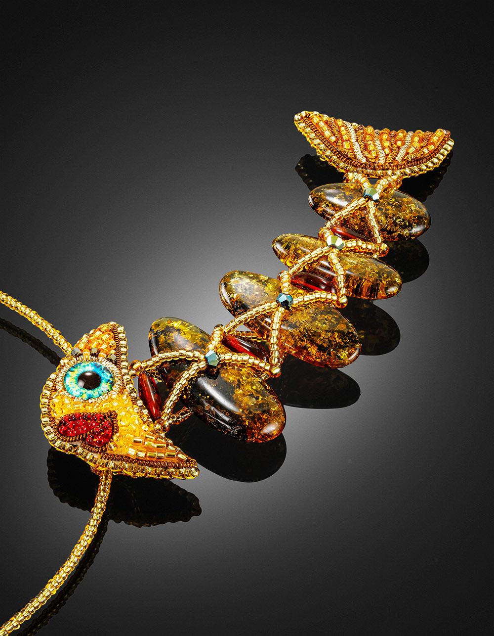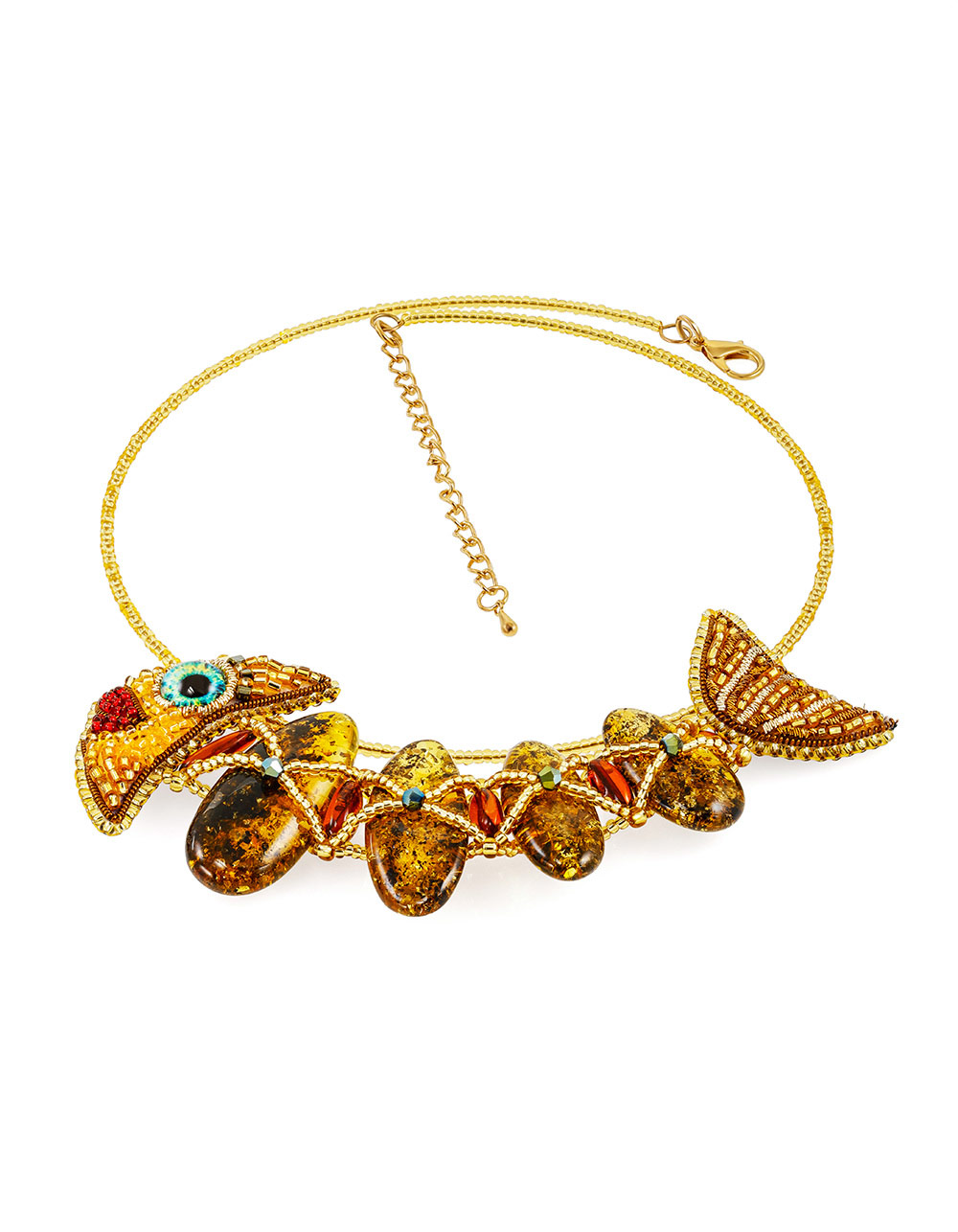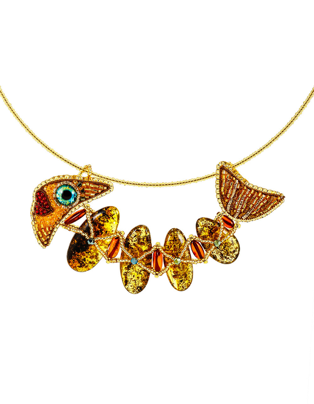 Необычное колье из бисера и натурального янтаря с подвеской-рыбкой «Лукоморье»