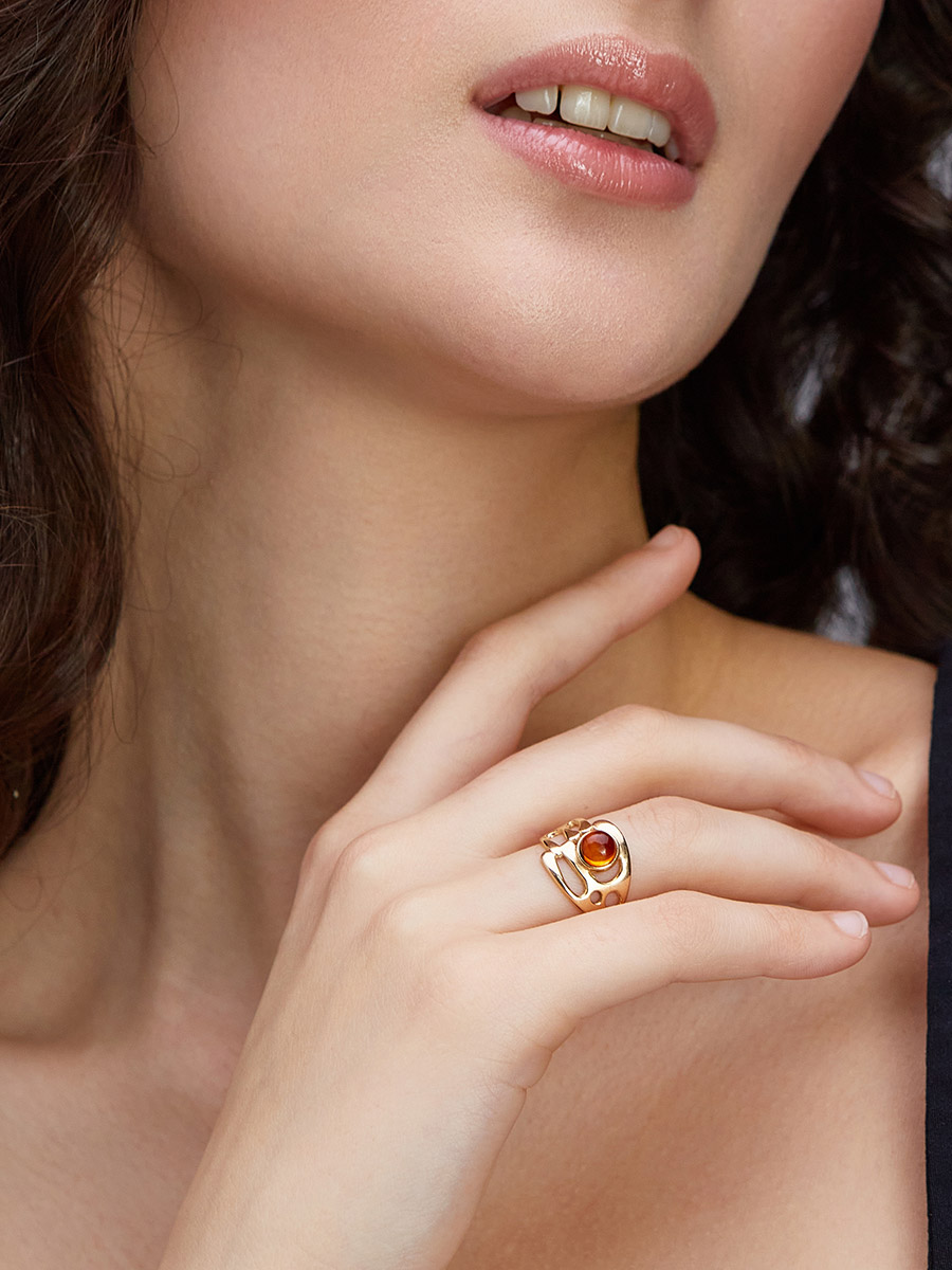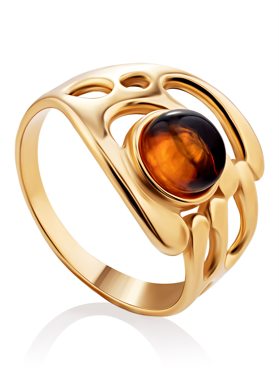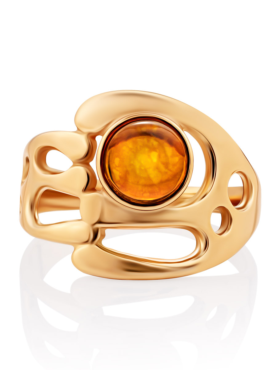 Необычное позолоченное кольцо «Иллюзия» с натуральным коньячным янтарём