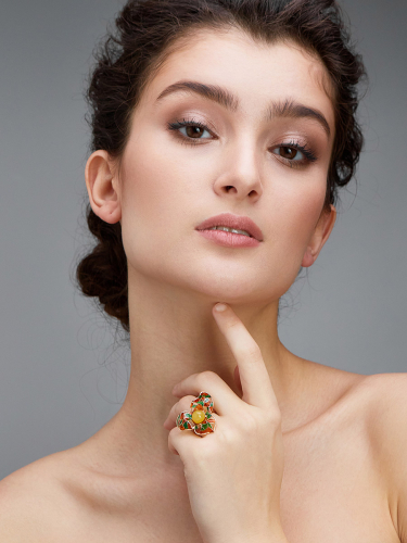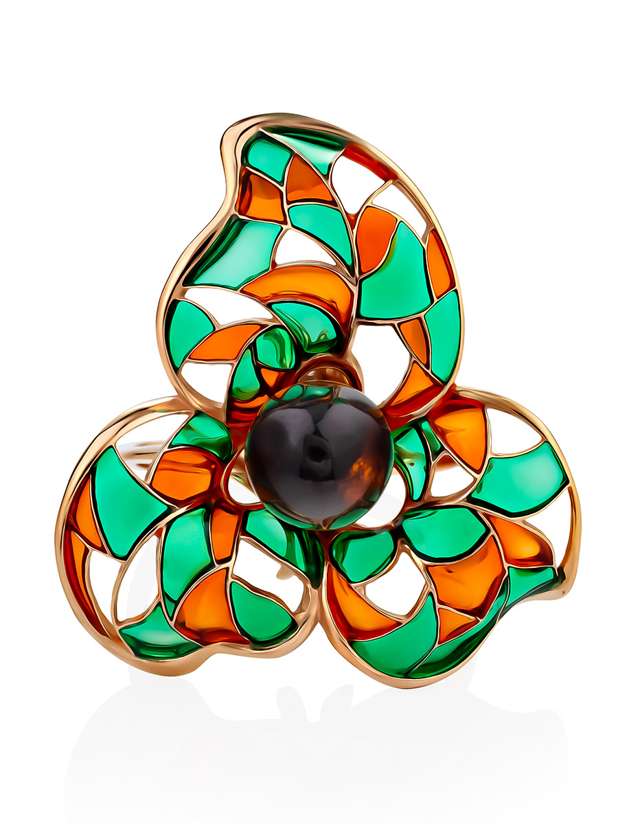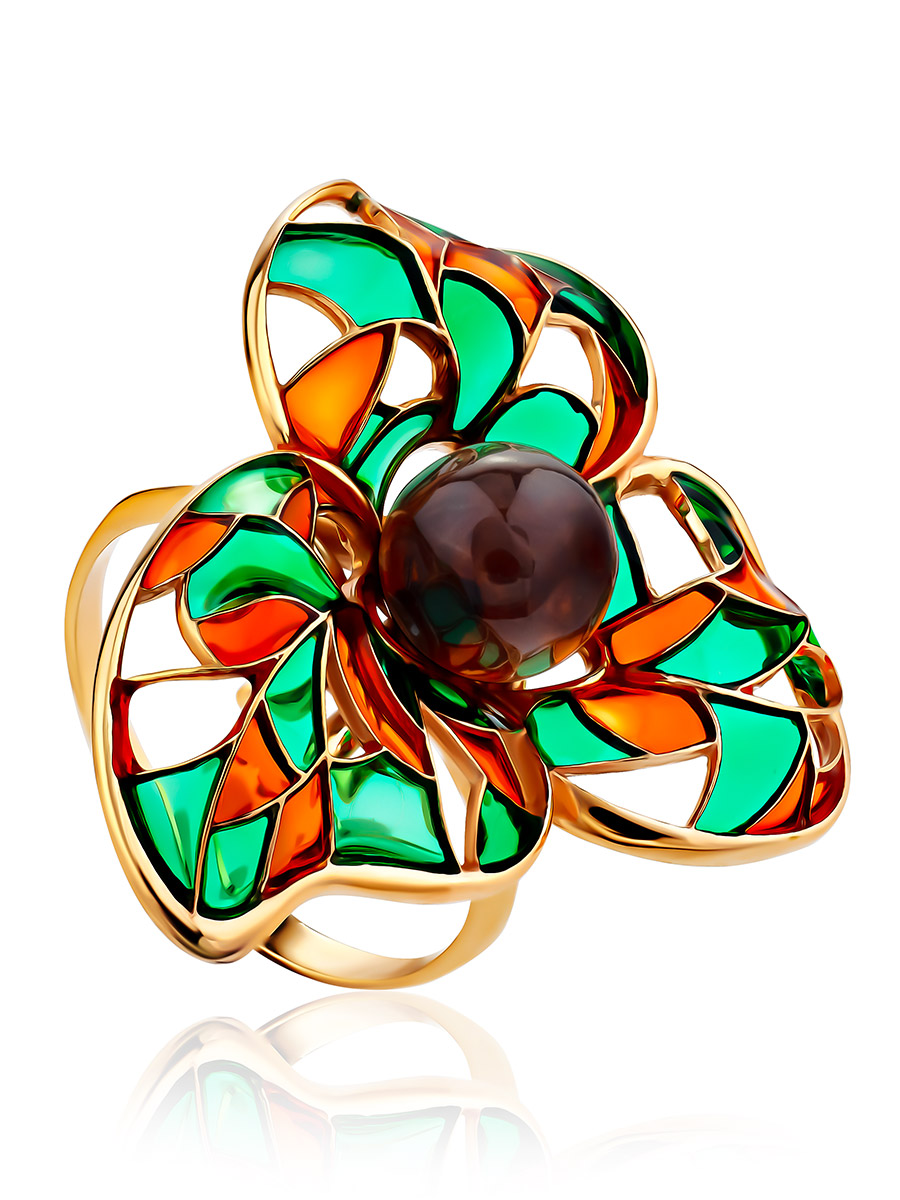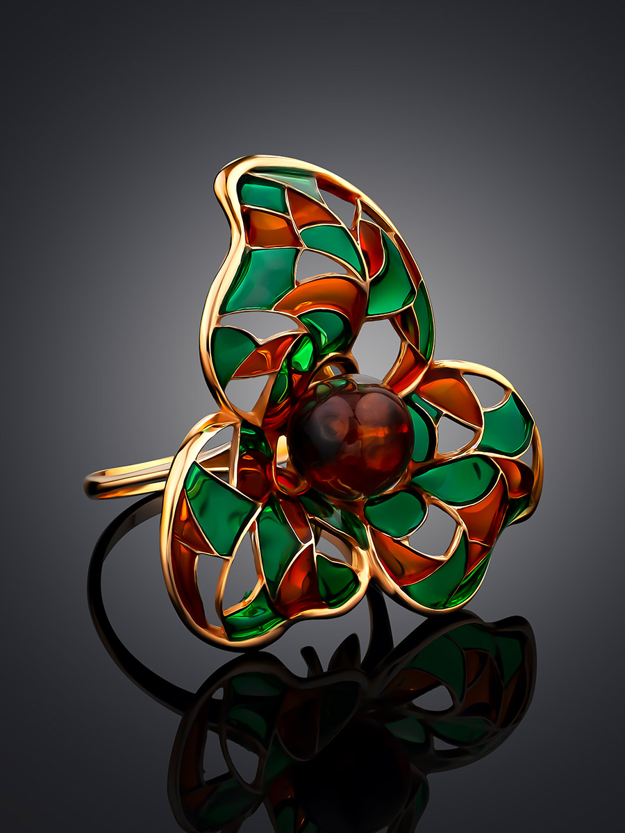 Необычное яркое кольцо с эмалью и натуральным янтарём Verona