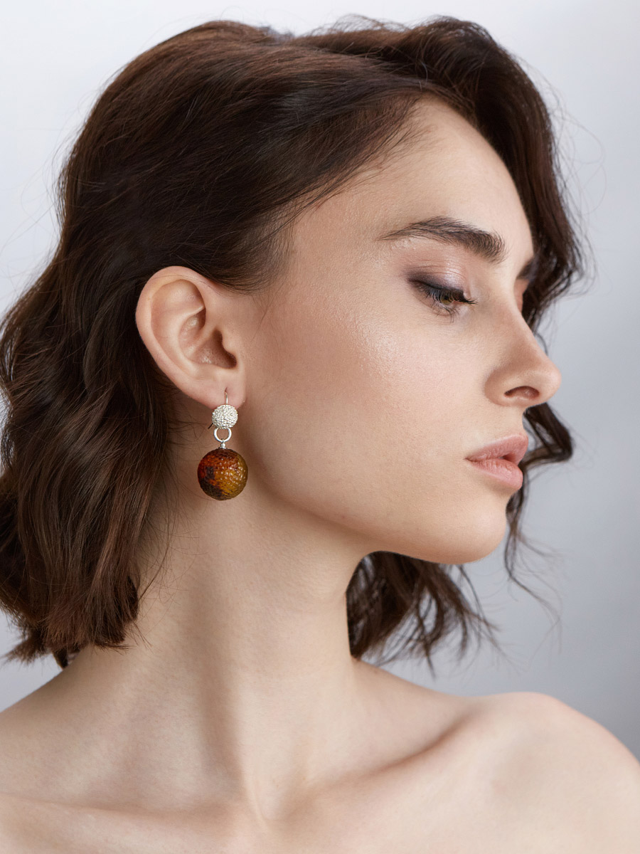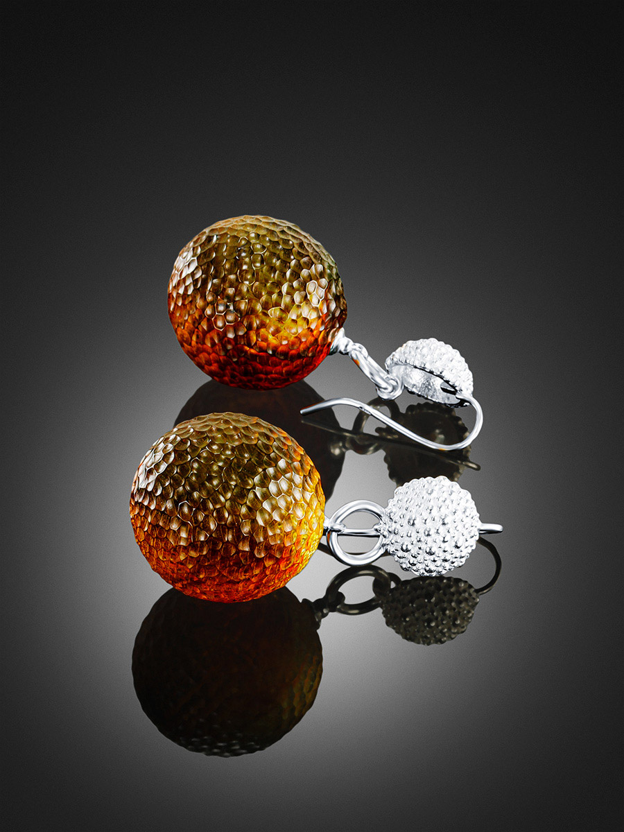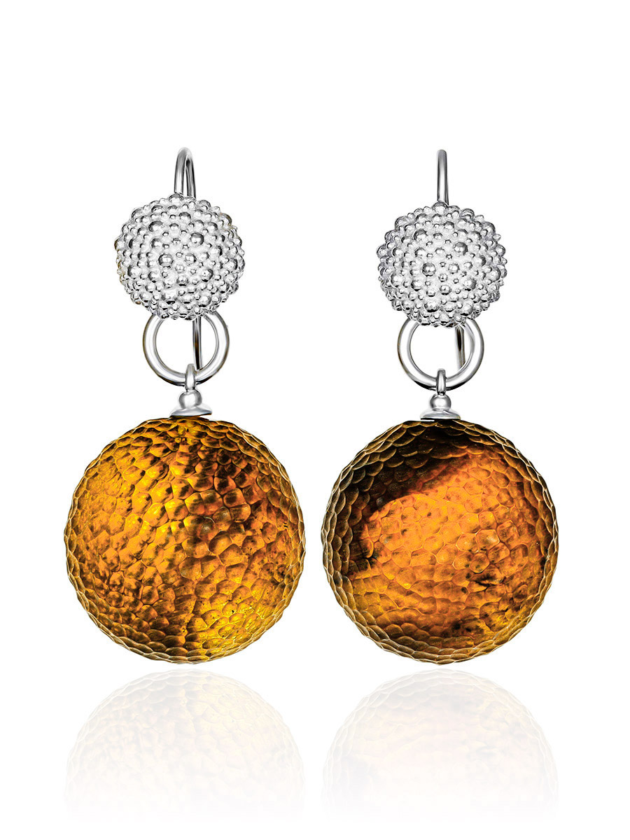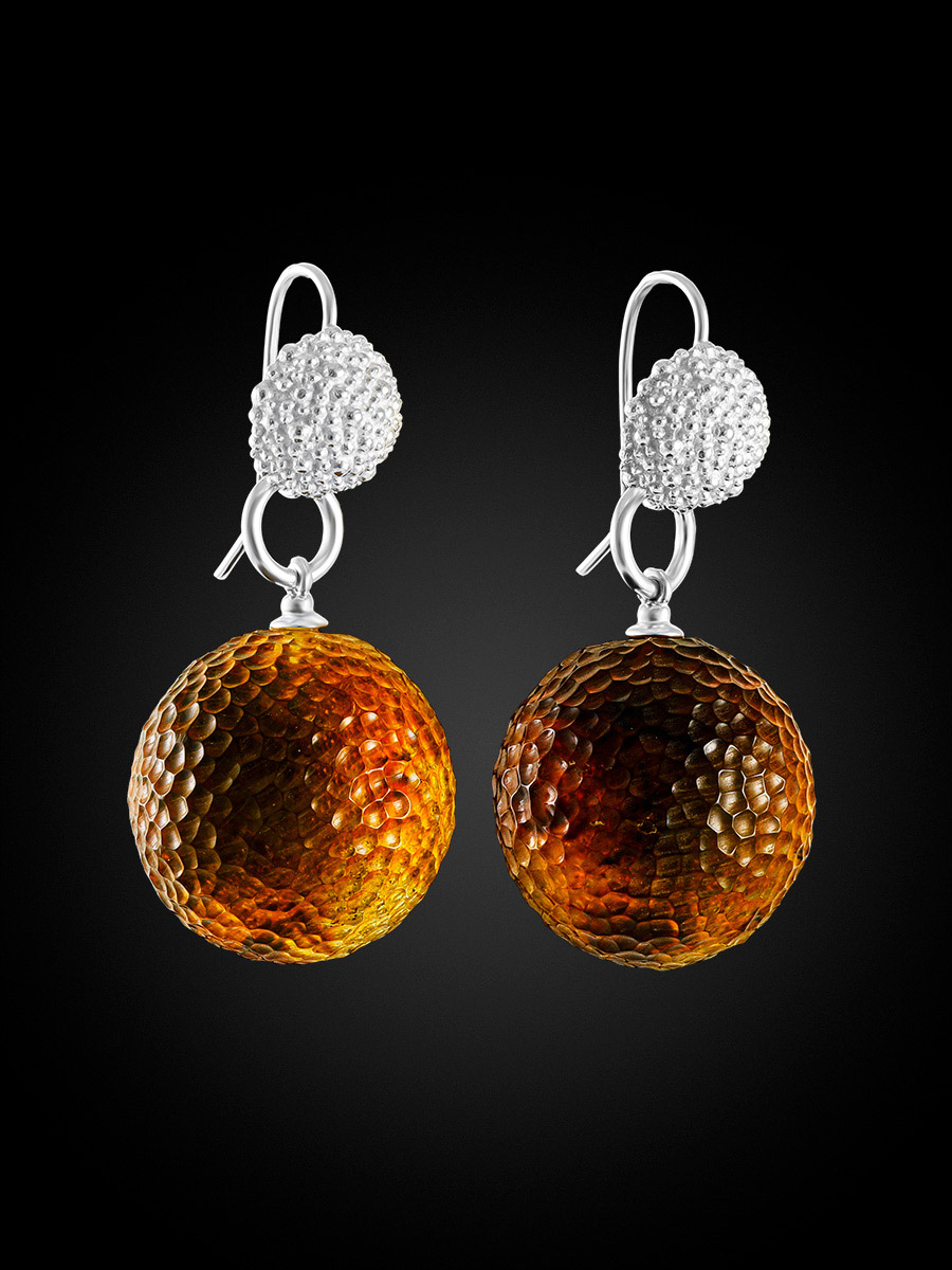 Необычные объёмные серьги «Марс» с кусаным цельным янтарём