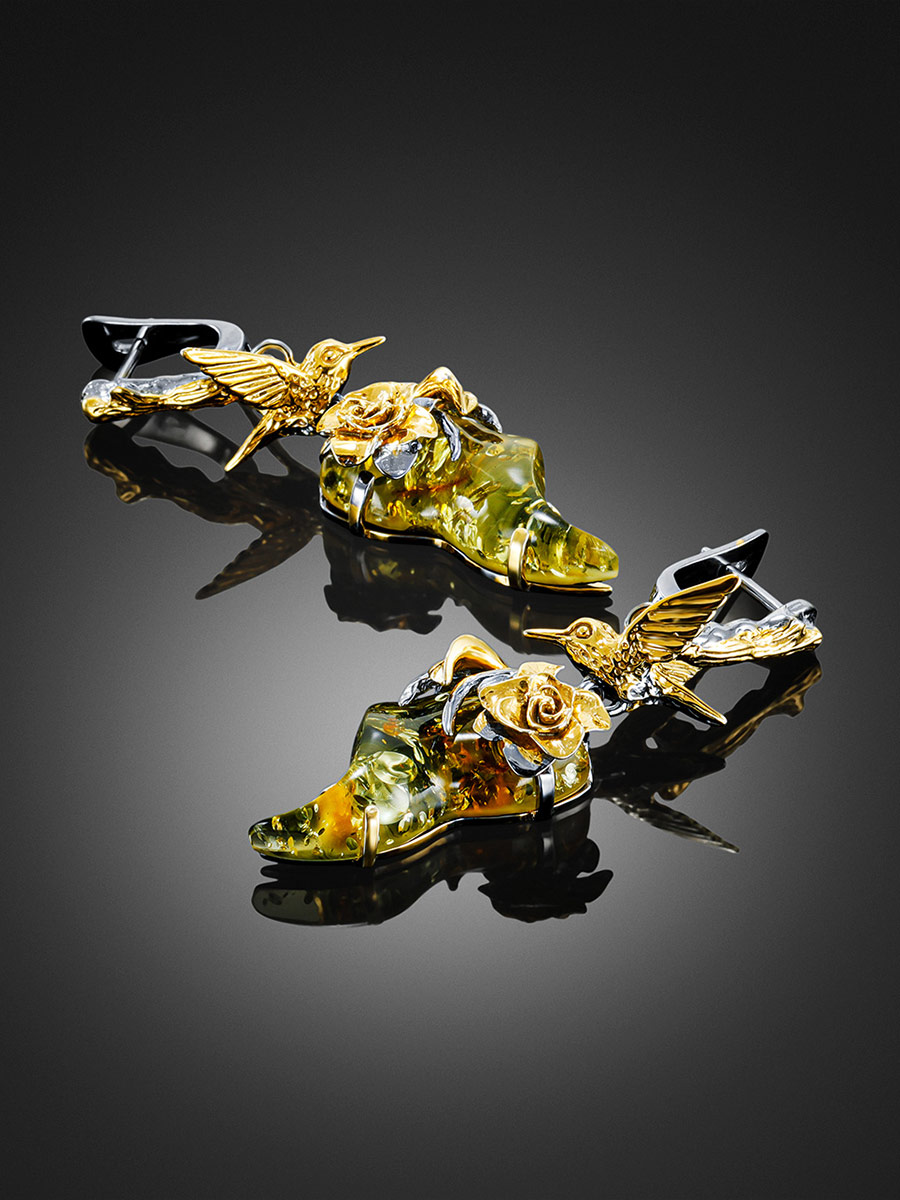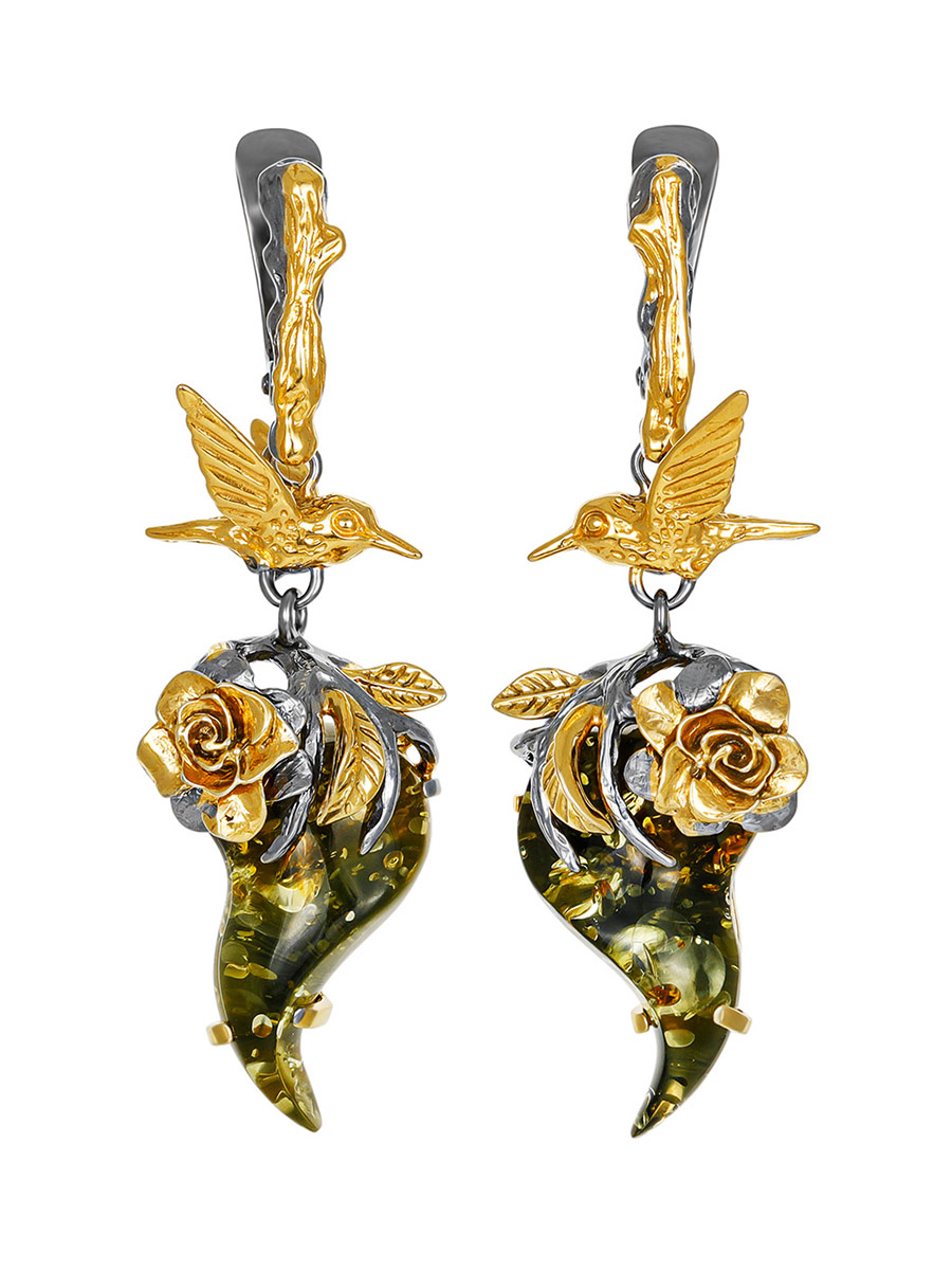 Необычные серьги «Колибри» из зелёного янтаря в оправе с золочением
