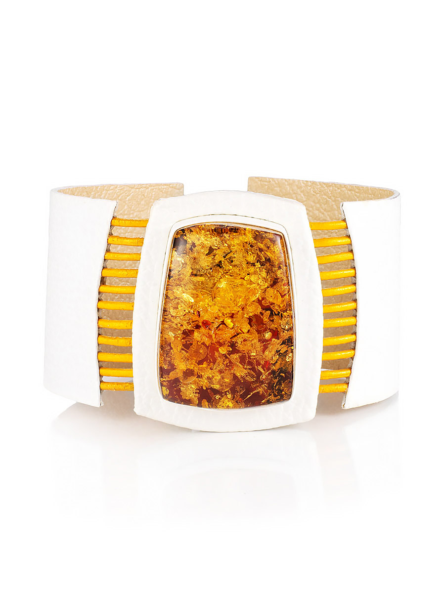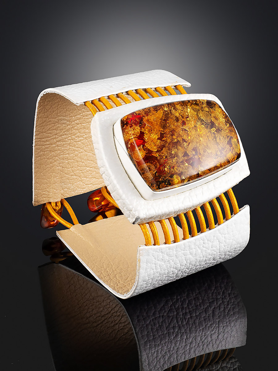 Необычный браслет из белой кожи и искрящегося янтаря «Амазонка»