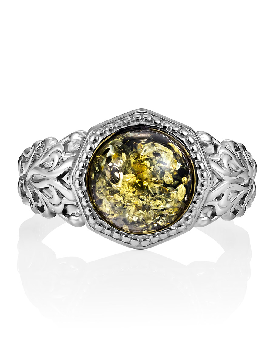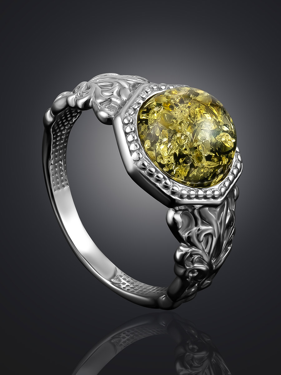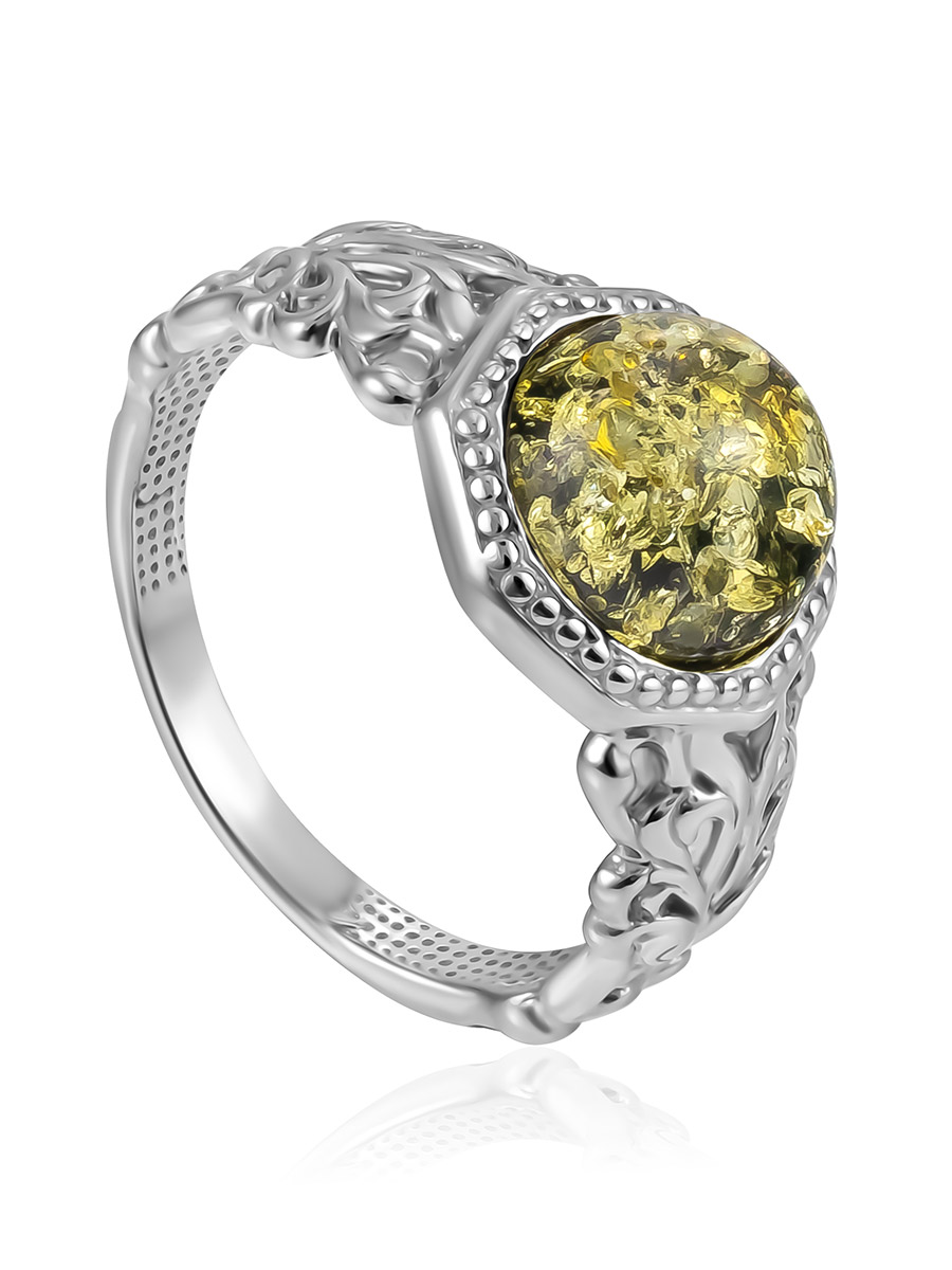 Нежное ажурное кольцо с натуральным зелёным янтарём «Шахерезада»