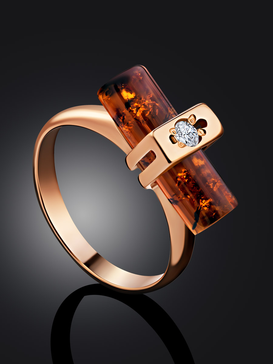 Нежное и стильное кольцо «Скандинавия» из янтаря коньячного цвета с фианитом