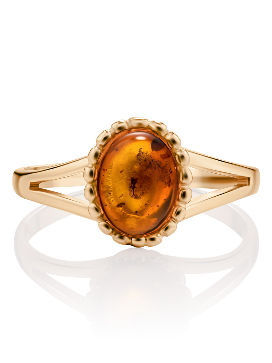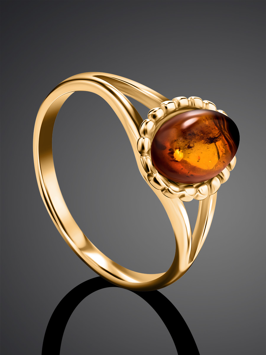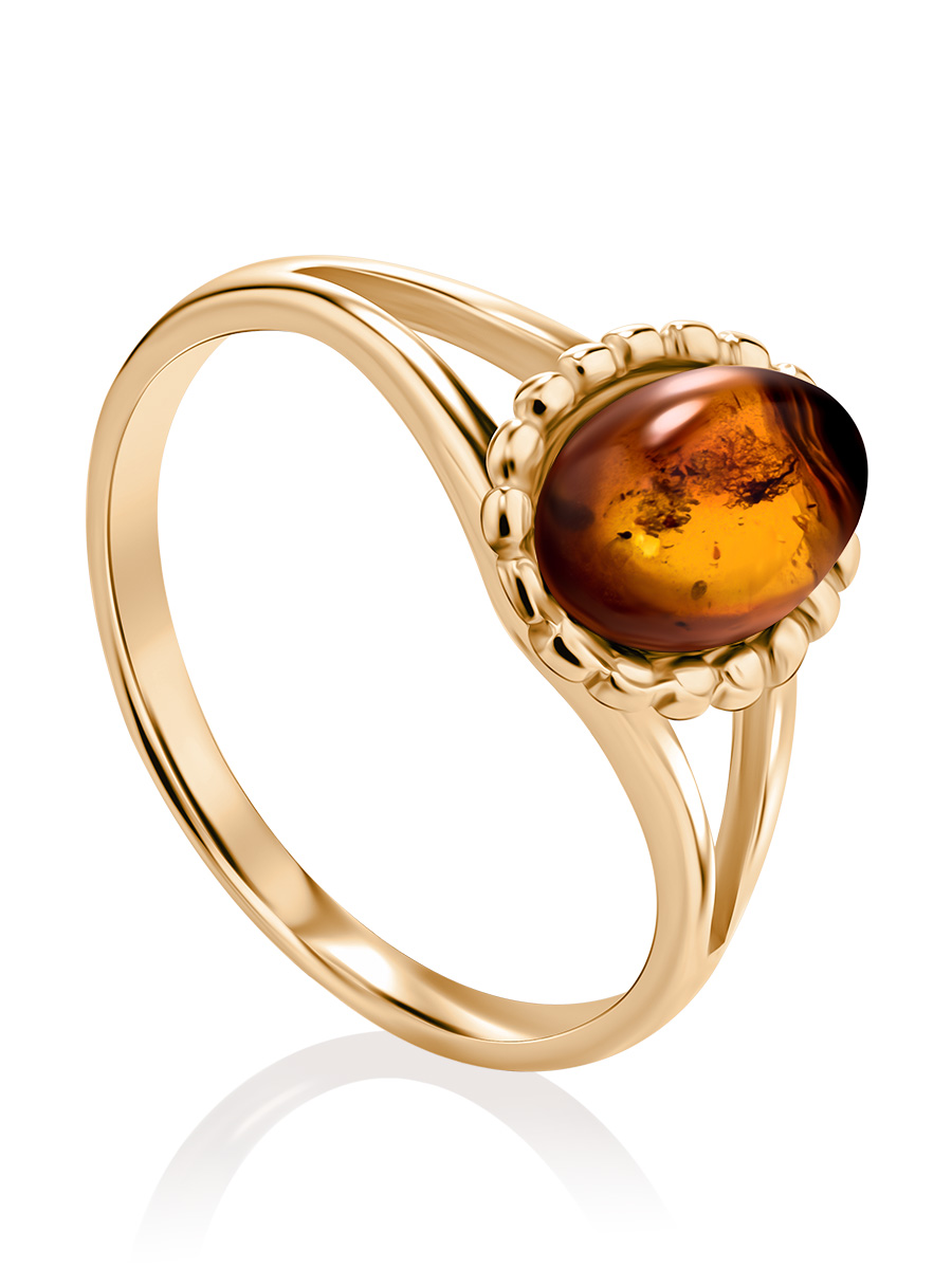 Нежное кольцо «Флоренция» из серебра в позолоте с янтарём коньячного цвета