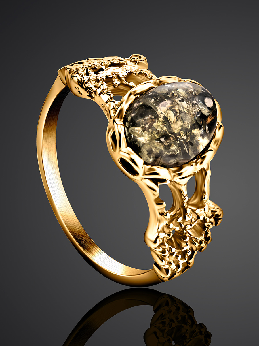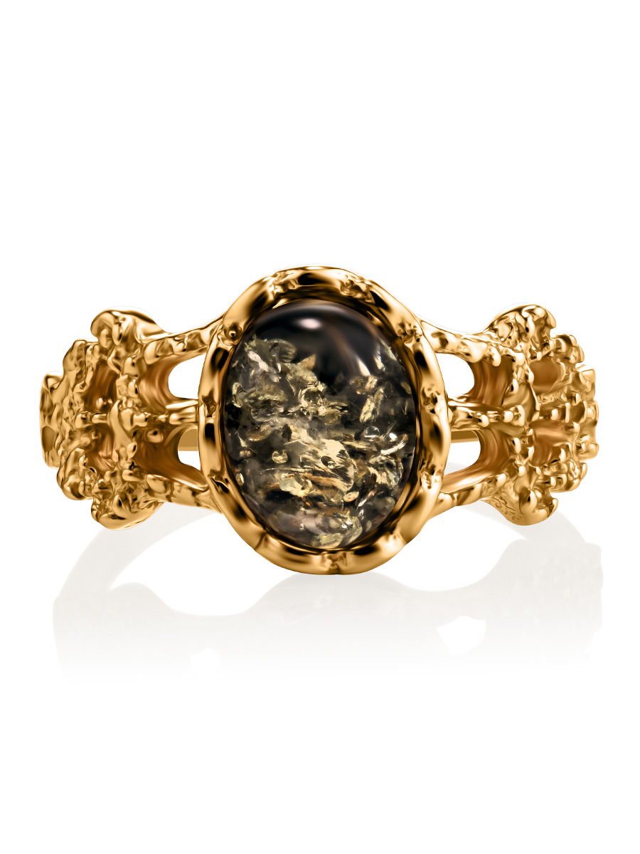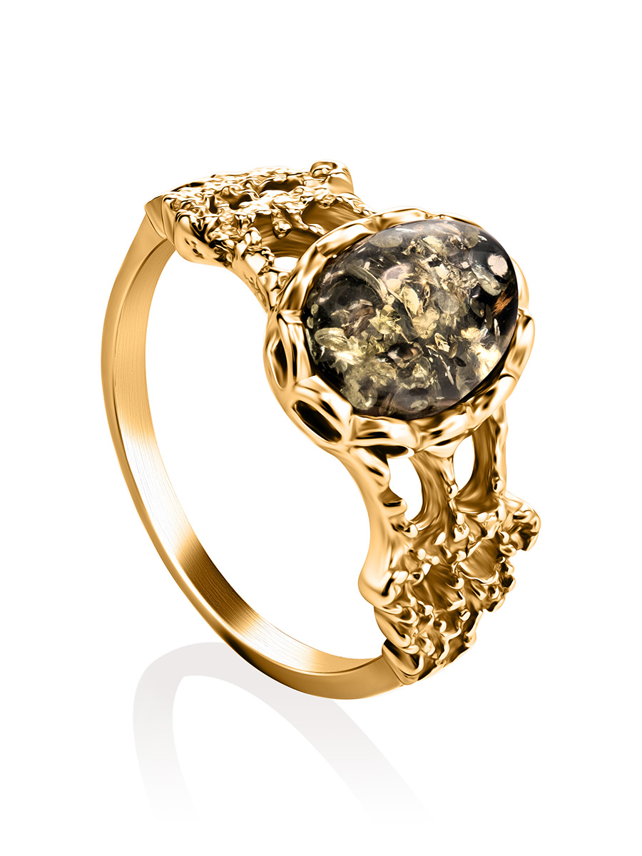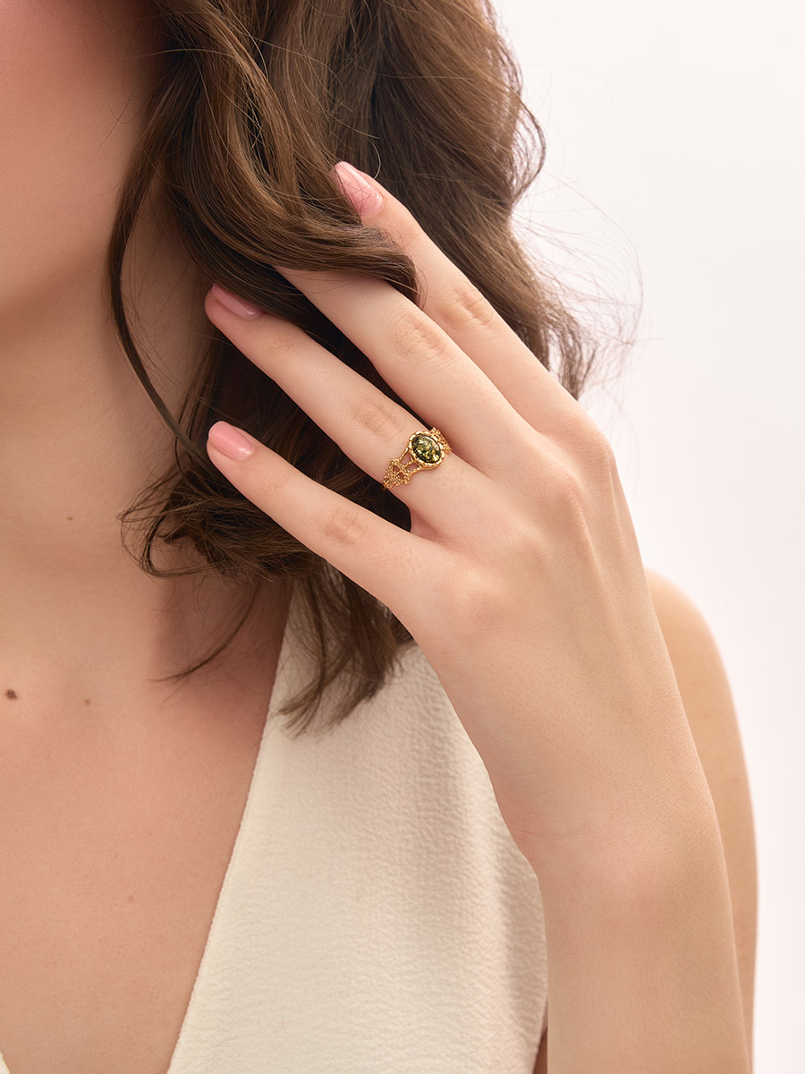 Нежное кольцо из позолоченного серебра и янтаря зелёного цвета «Флоренция»
