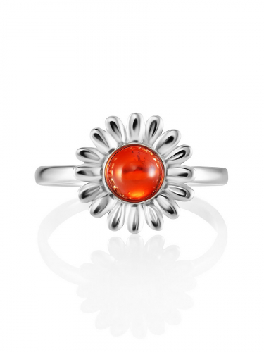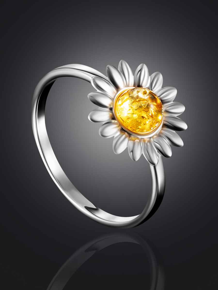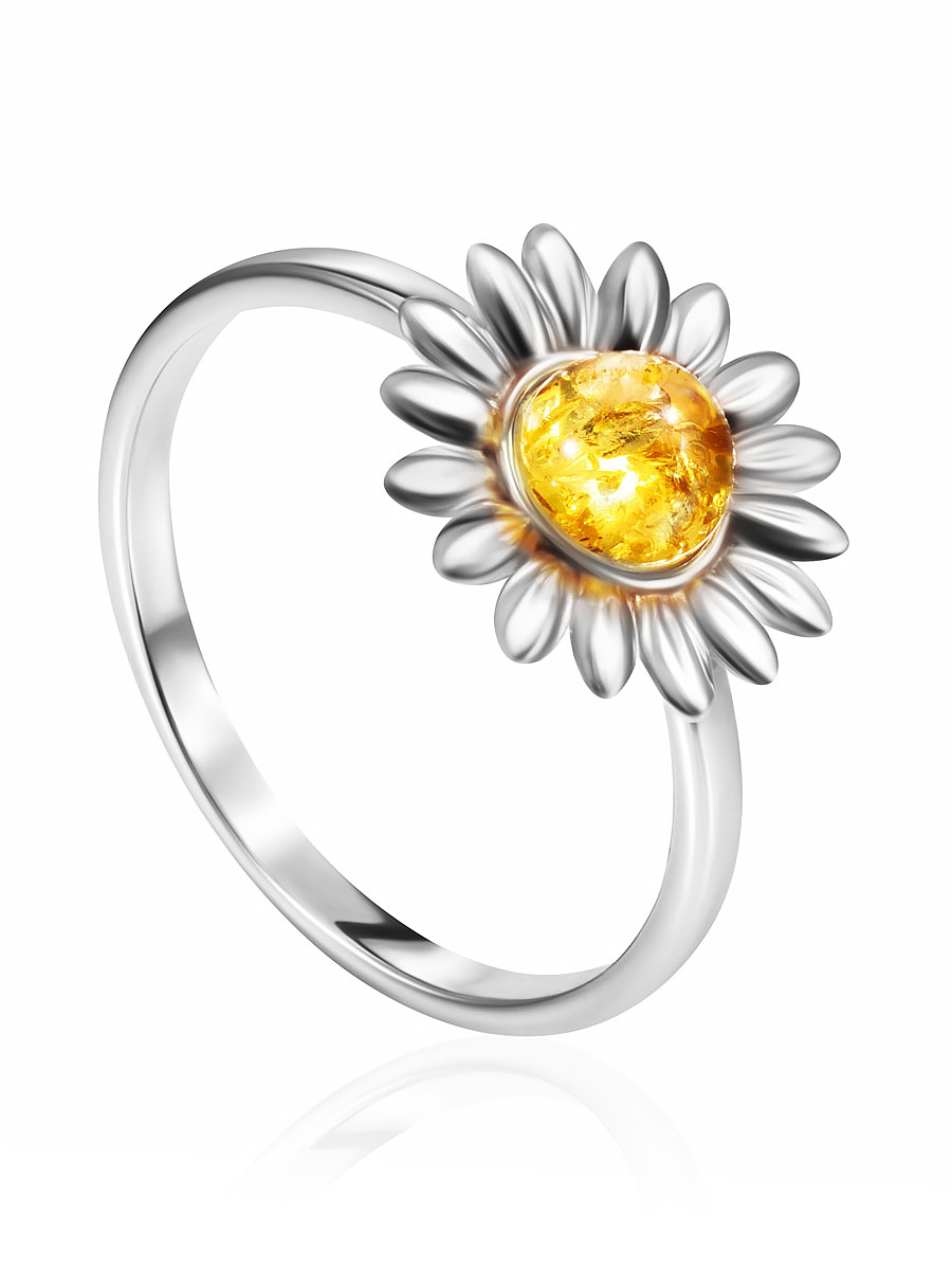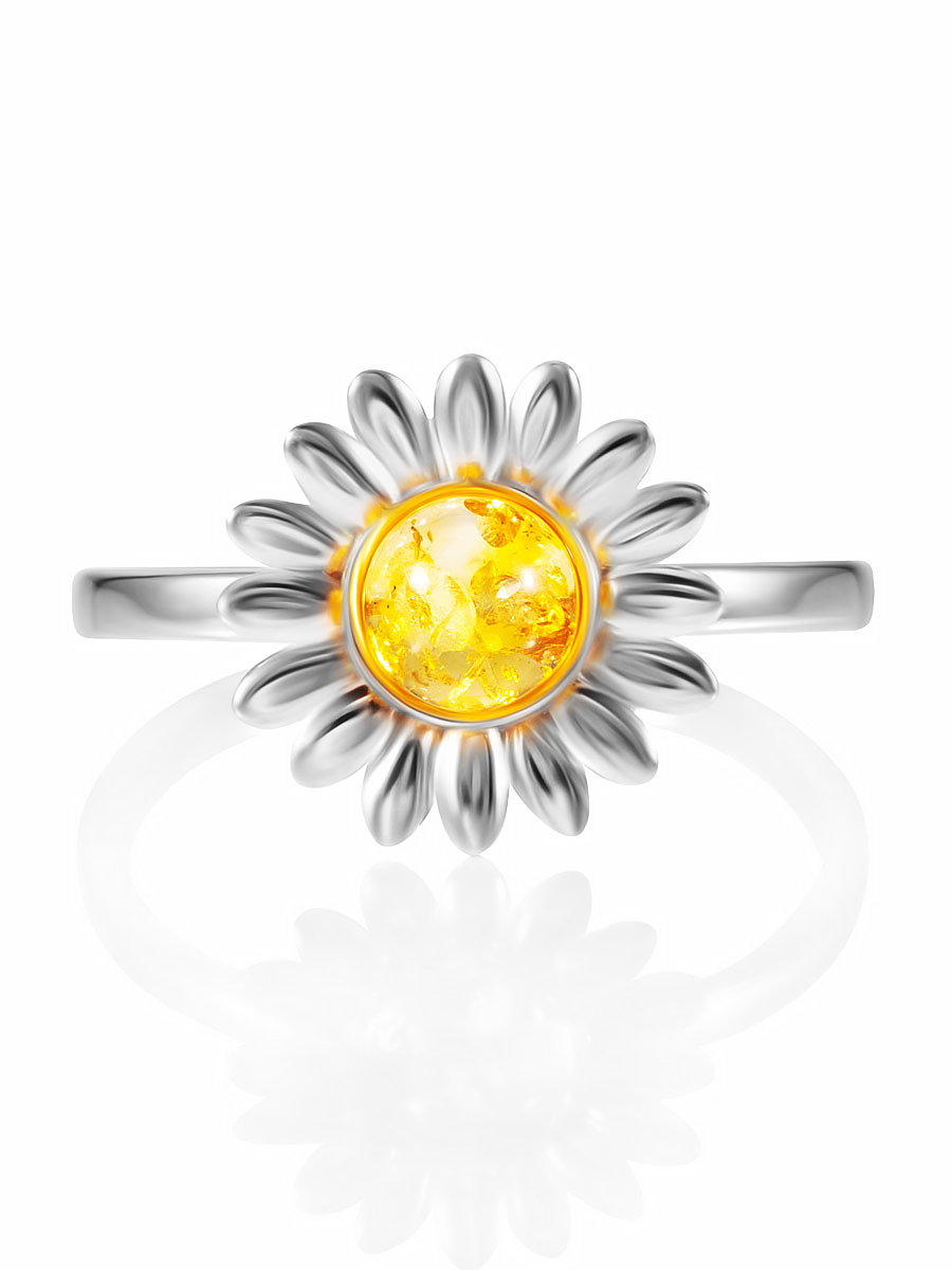 Нежное кольцо с ярко-лимонным янтарём «Ромашка»