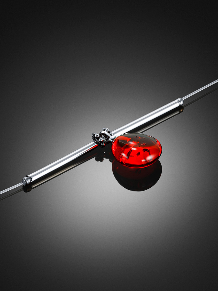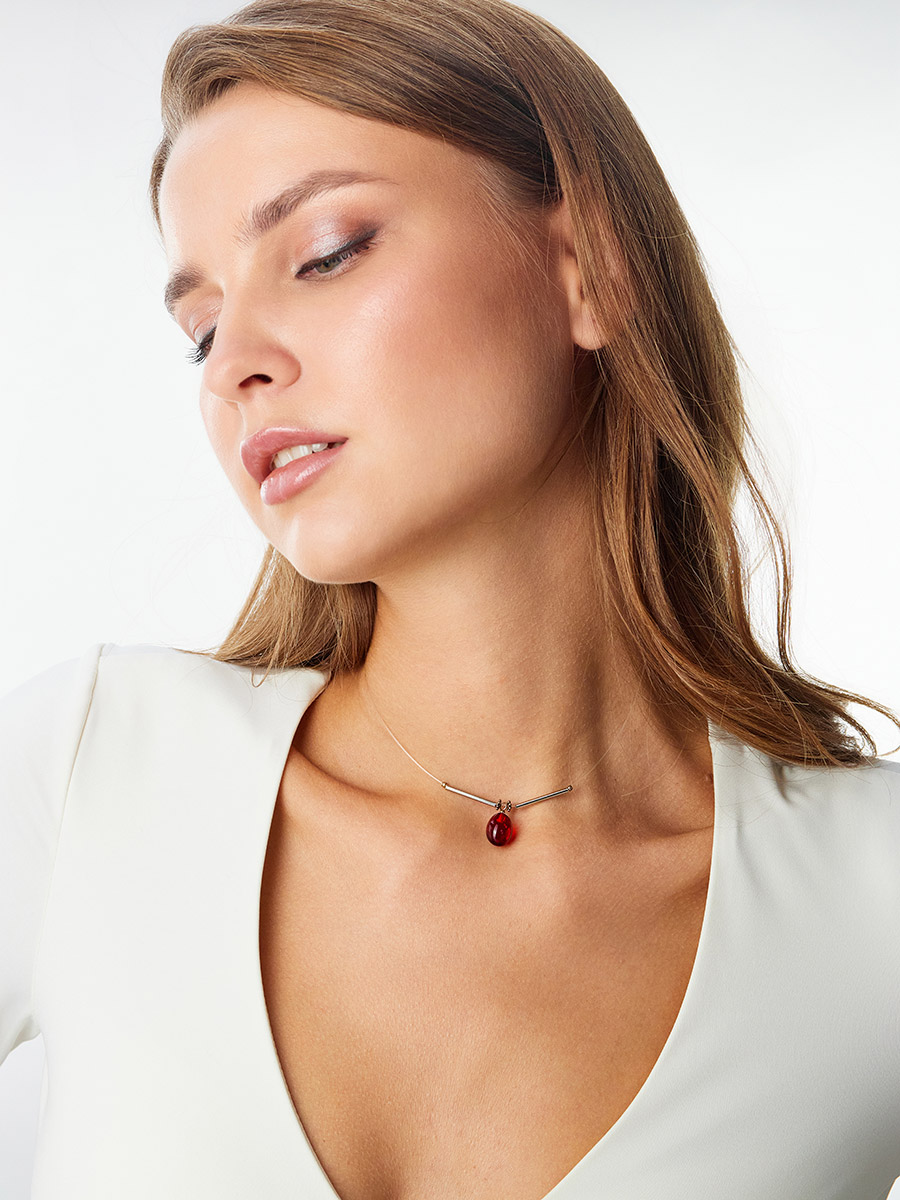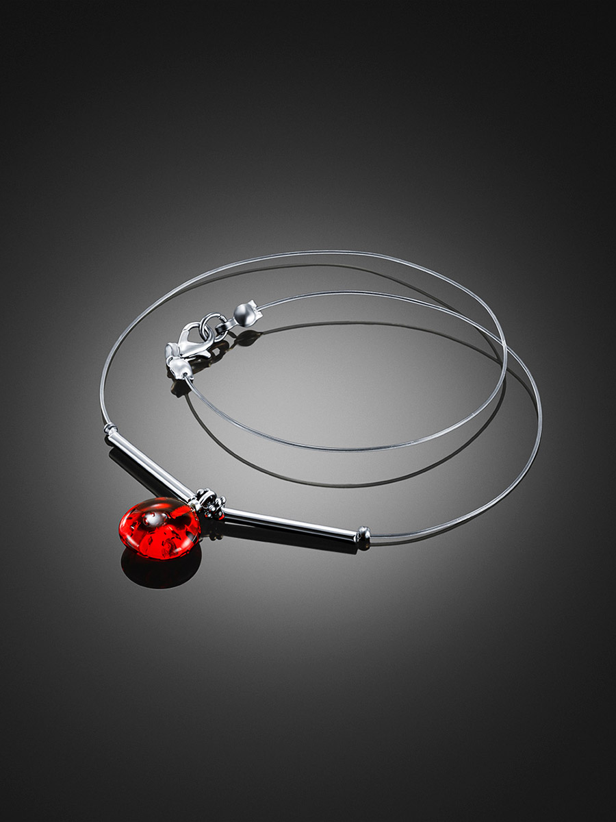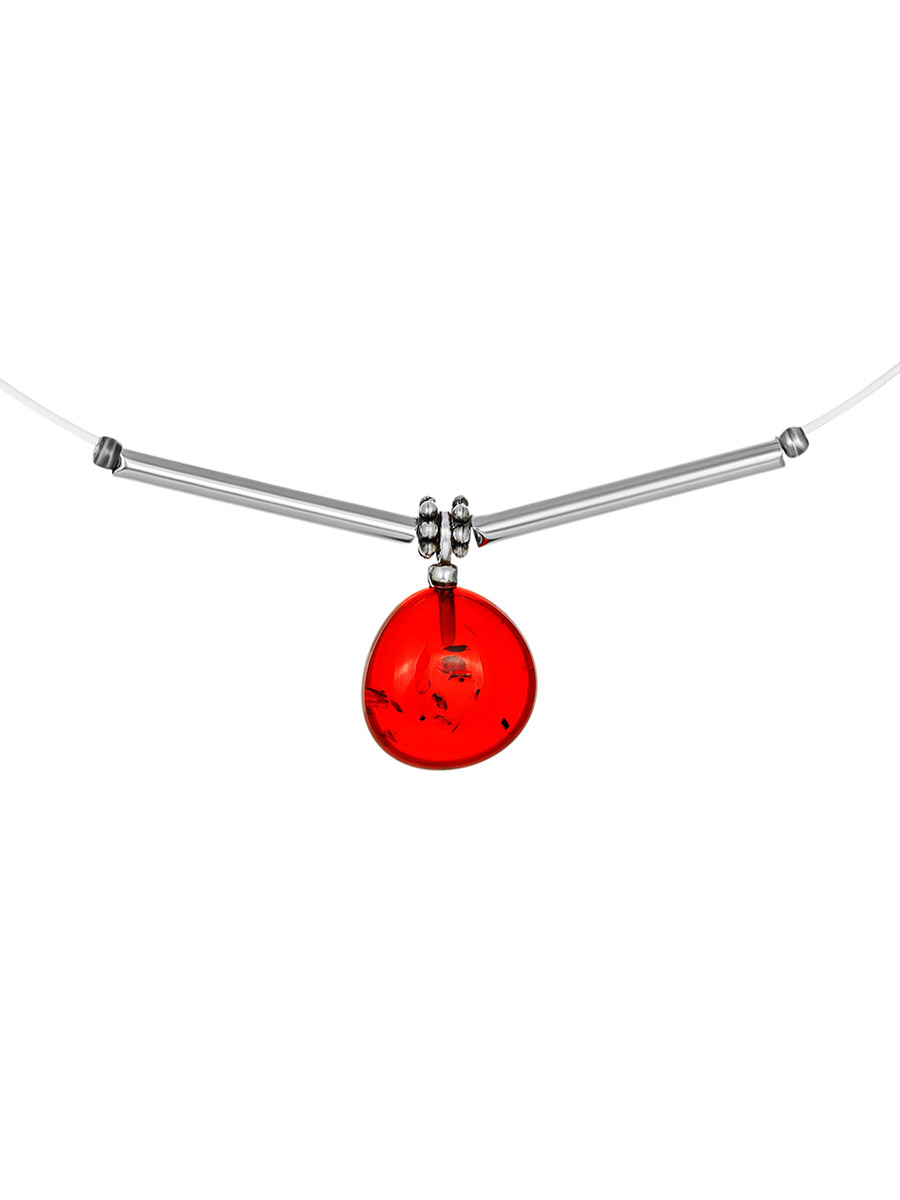 Нежное колье-леска с подвеской из ярко-алого янтаря «Росинка»