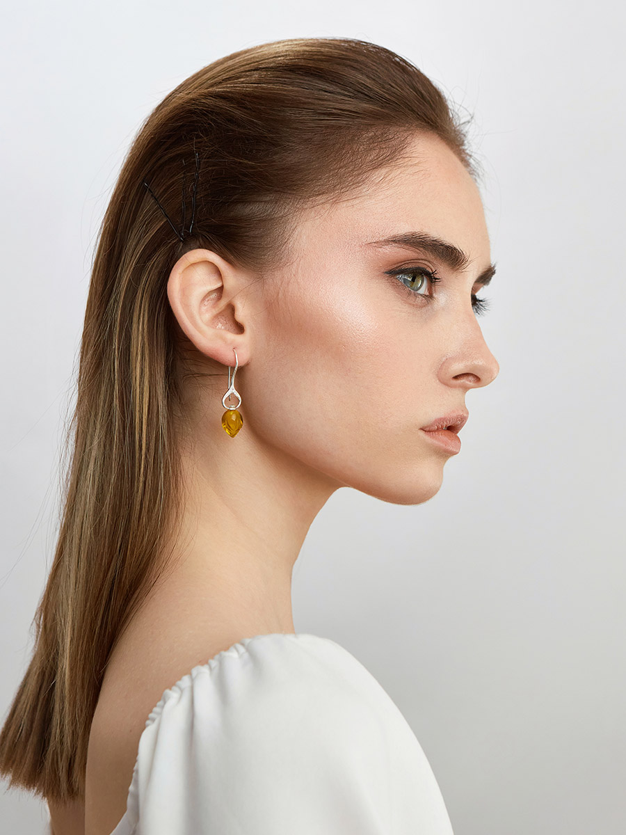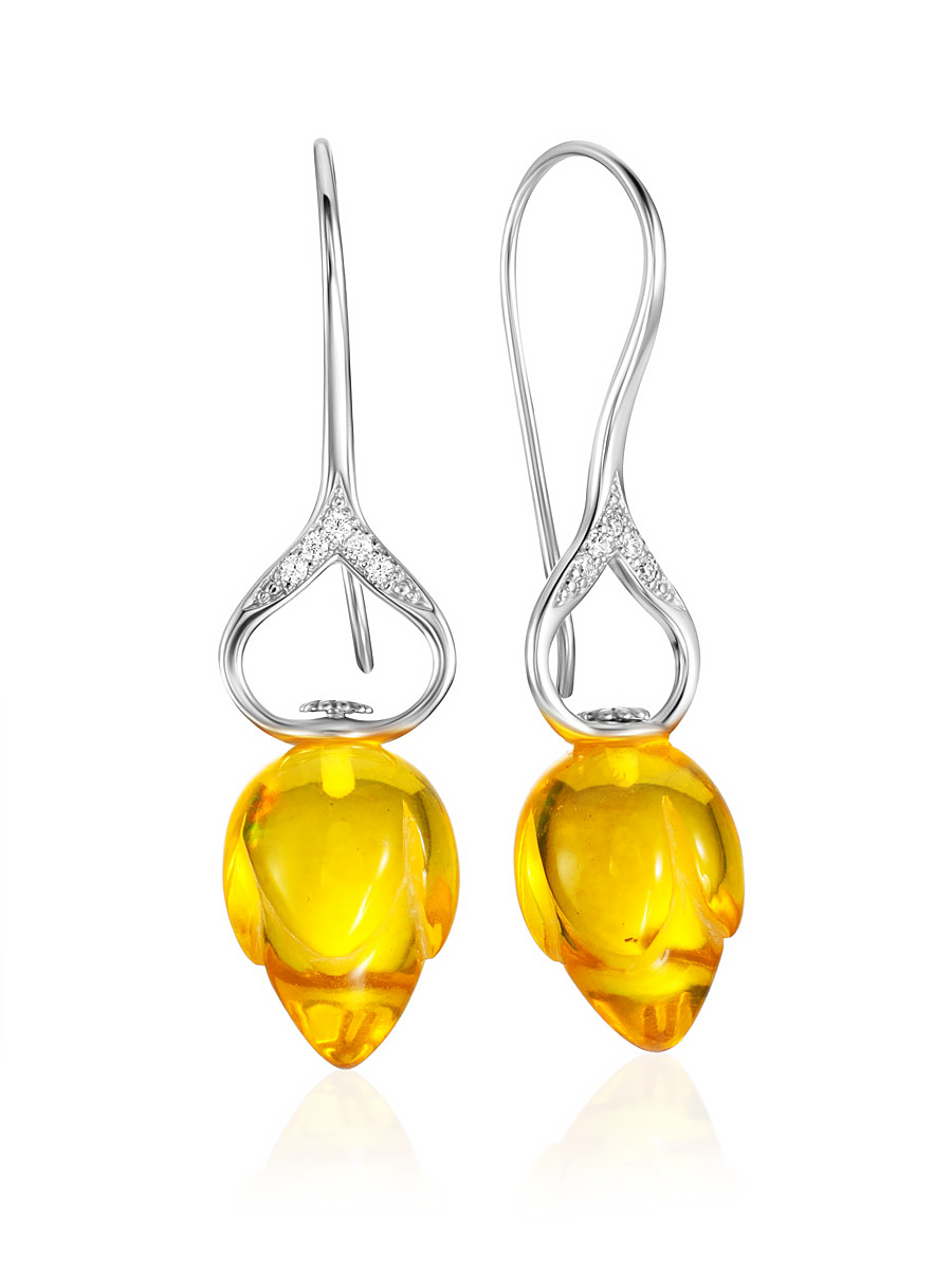 Нежные серьги-крючки «Тюльпан» с янтарём лимонного цвета и фианитами