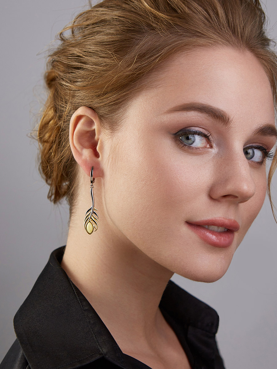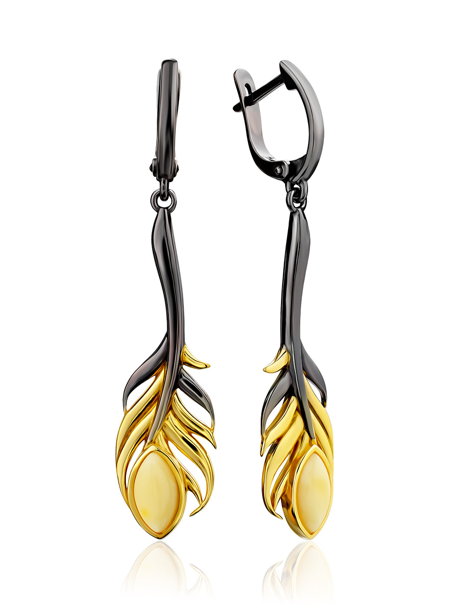 Нежные серьги с чернением и золочением, украшенные медовым янтарём «Пёрышко»