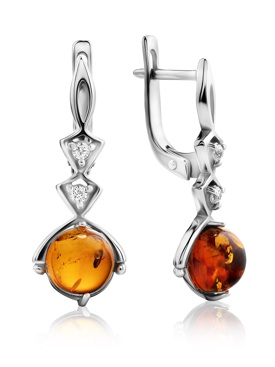 Удлинённые серьги на английском замочке из серебра 925 пробы украшены натуральным балтийским коньячным янтарём и цирконами. Женственные и очень лёгкие, эти серьги будут незаменимы для дополнения повседневных образов, изящным штрихом подчёркивая ваш тонкий вкус. _x000D_