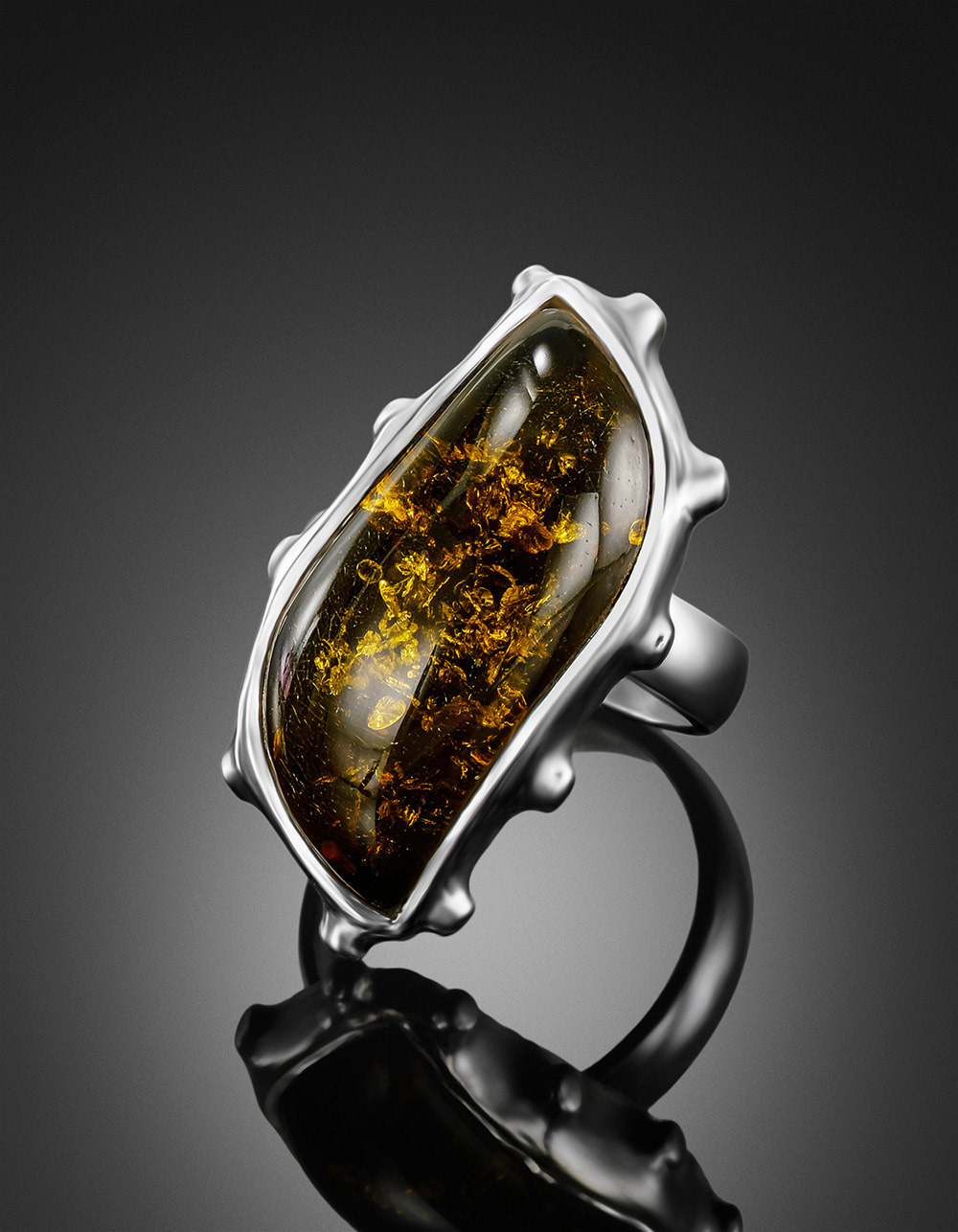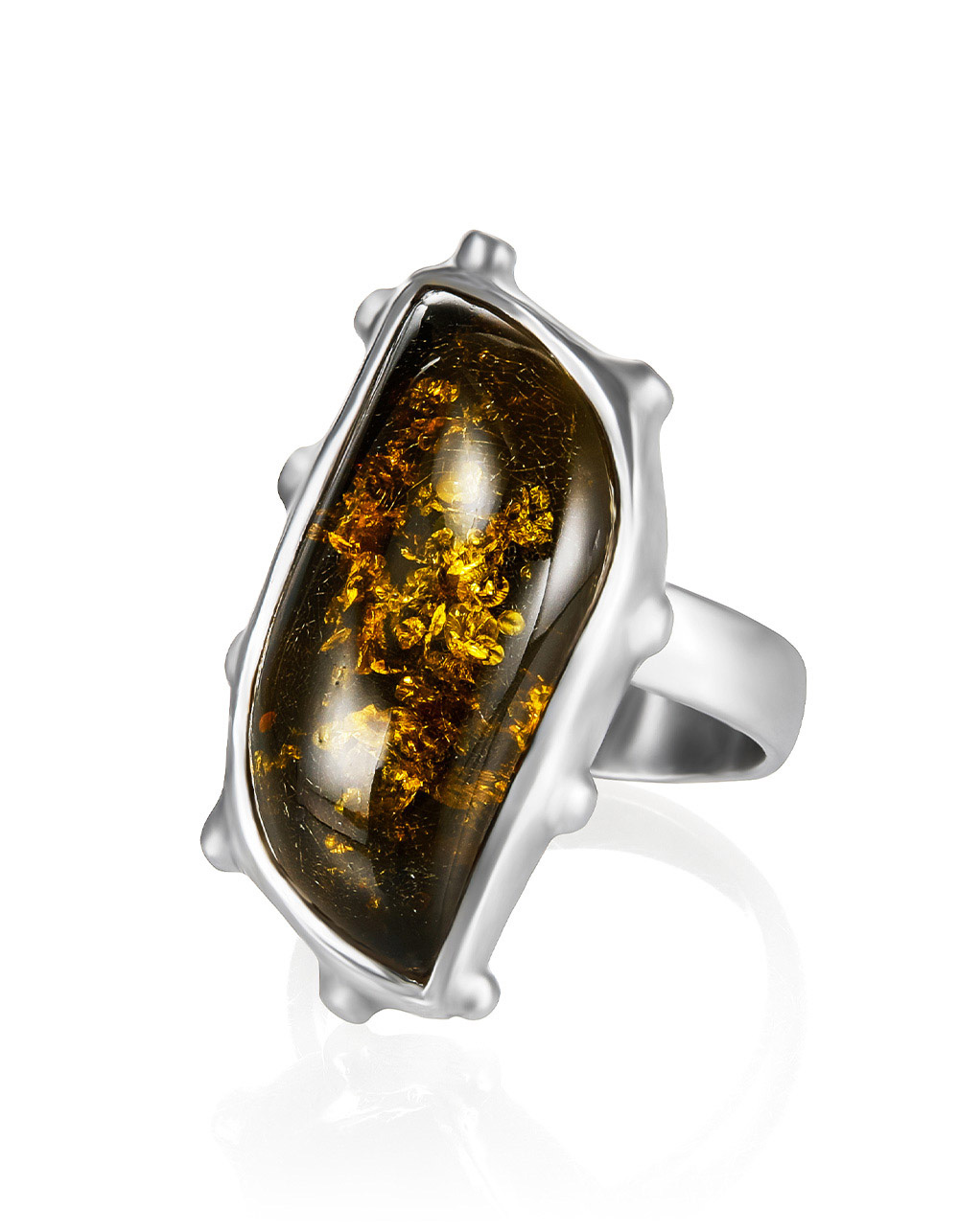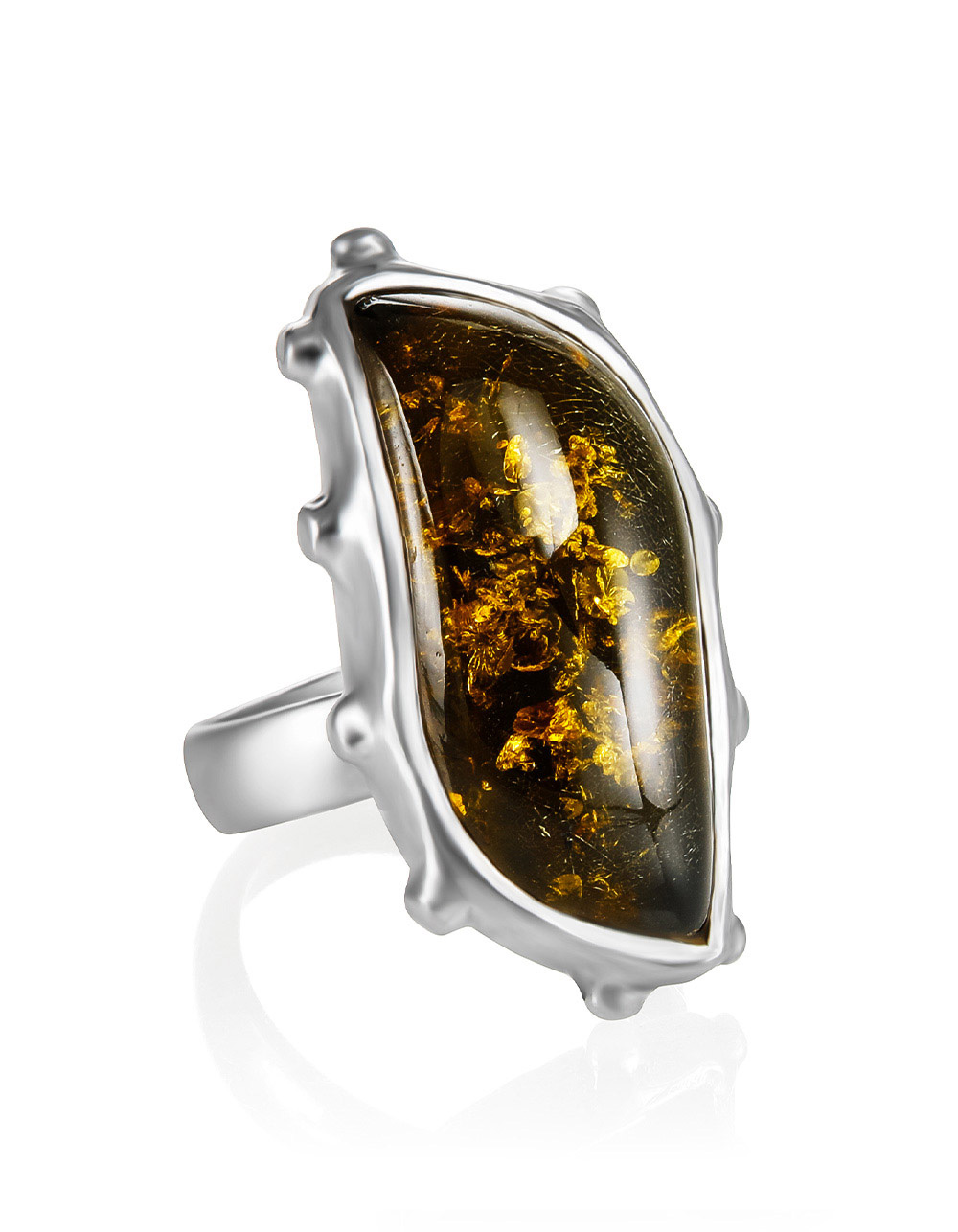 Объёмное кольцо с натуральным сверкающим янтарем зелёного оттенка «Винтаж»