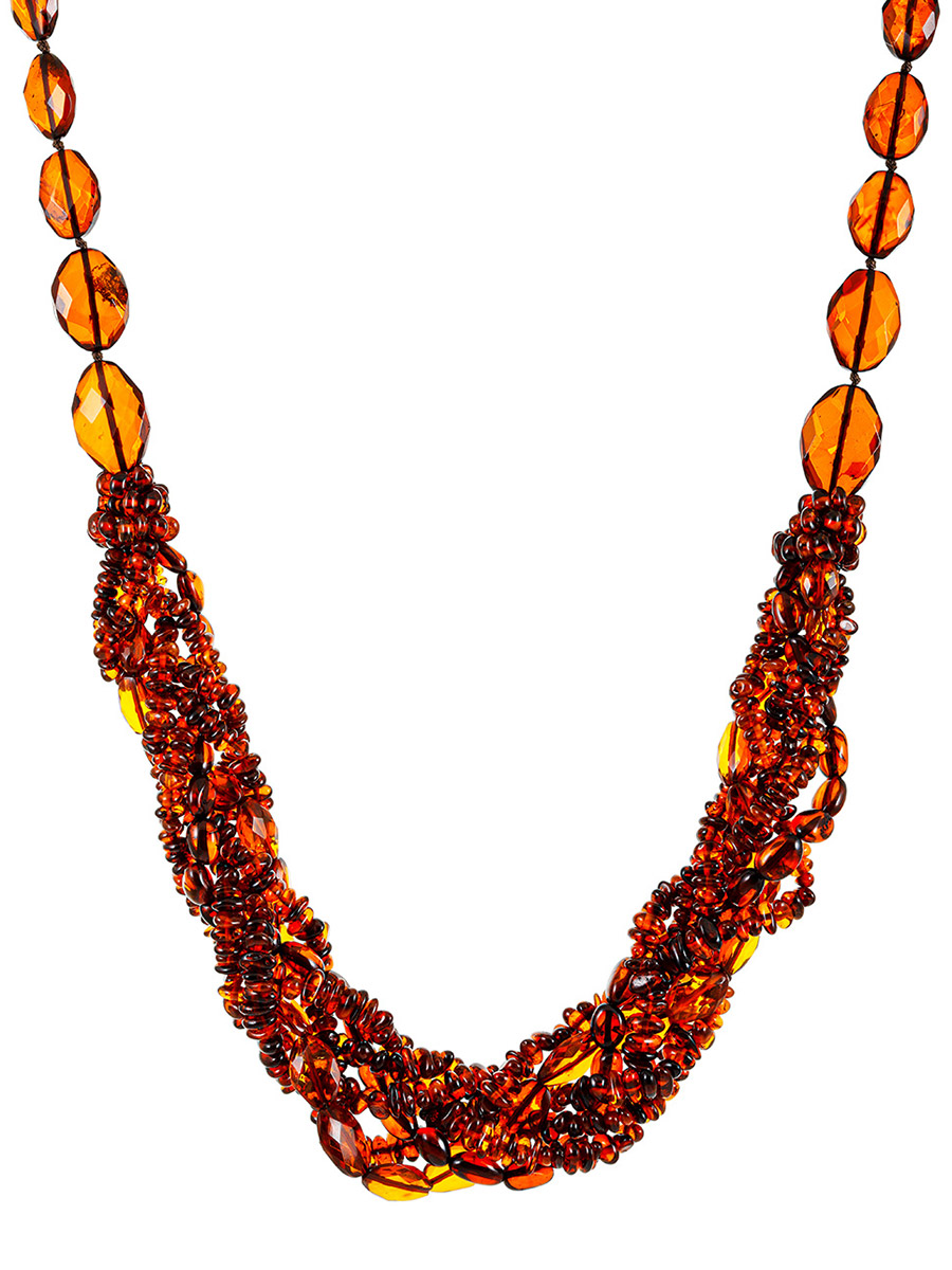 Объёмное плетёное колье из янтаря вишнёвого цвета «Оливка алмазная»