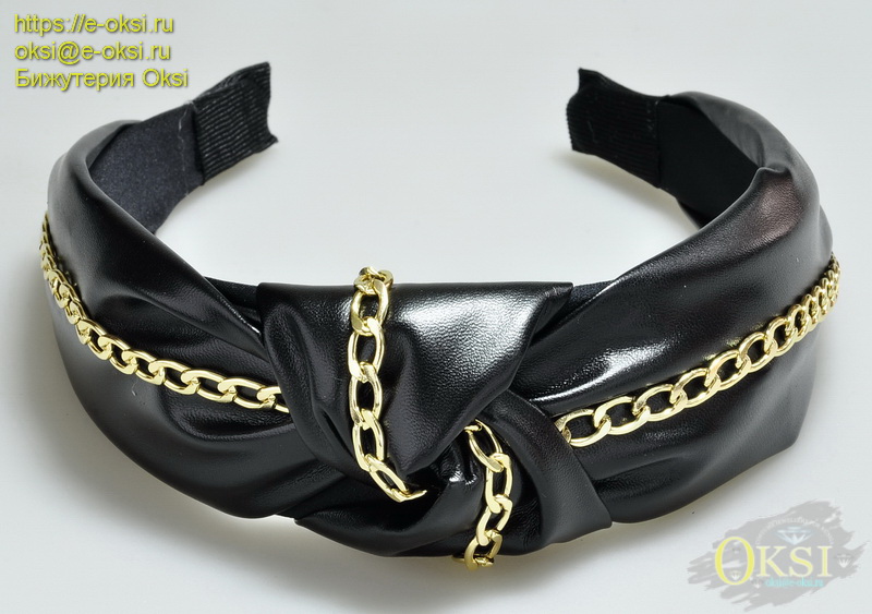 Стильный ободок чёрного цвета из эко - кожи, украшен золотистой цепочкой. Роскошное сочетание двух базовых цветов - золотого и чёрного украсит и завержит любой образ. Размер: ширина ободка 5 см ( ширина основы ободка 4 см ) , высота ''верхушки '' около 2,5 см.