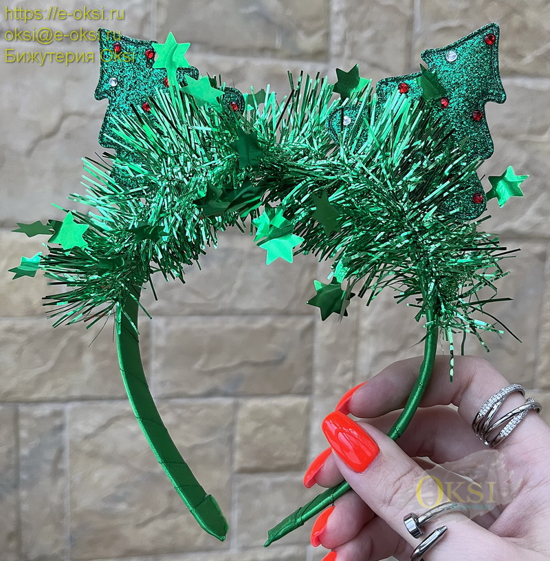 Эффектный новогодний ободок с яркими, зелёными ёлочками, создаст праздничную атмосферу на любой вечеринке. Подойдёт как взрослым. так и детям, не жмет и давит голову, не мешает вести активный образ жизни.