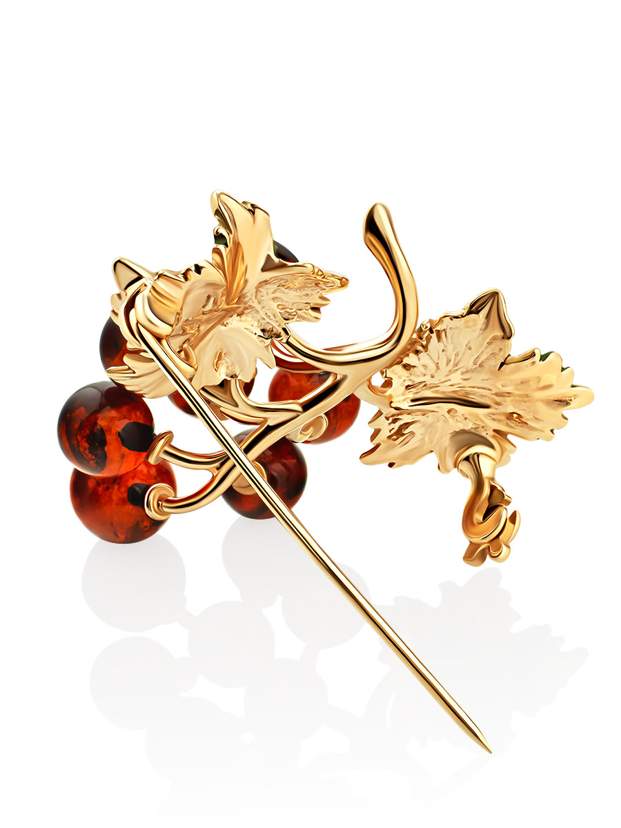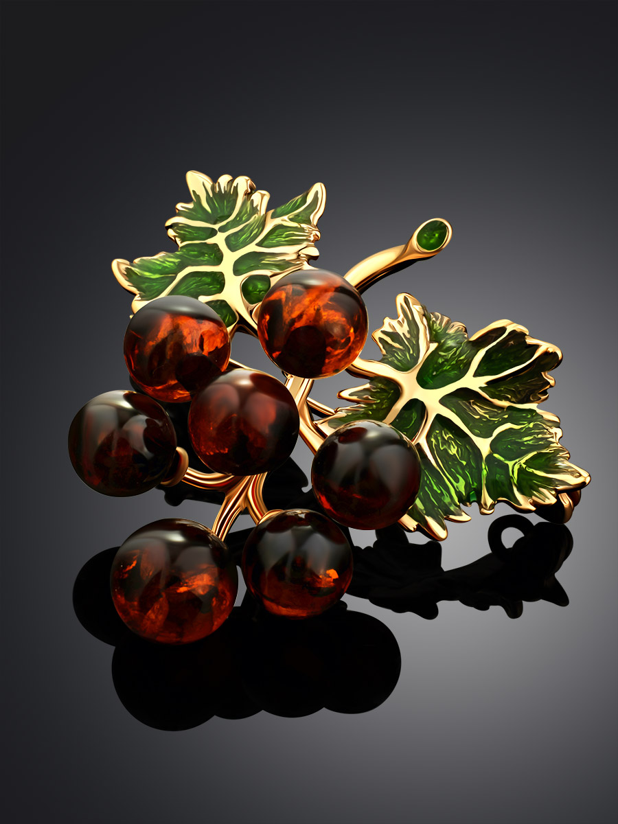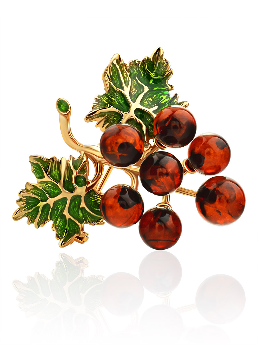 Очаровательная брошь «Виноград» в позолоте с эмалью, украшенная янтарем