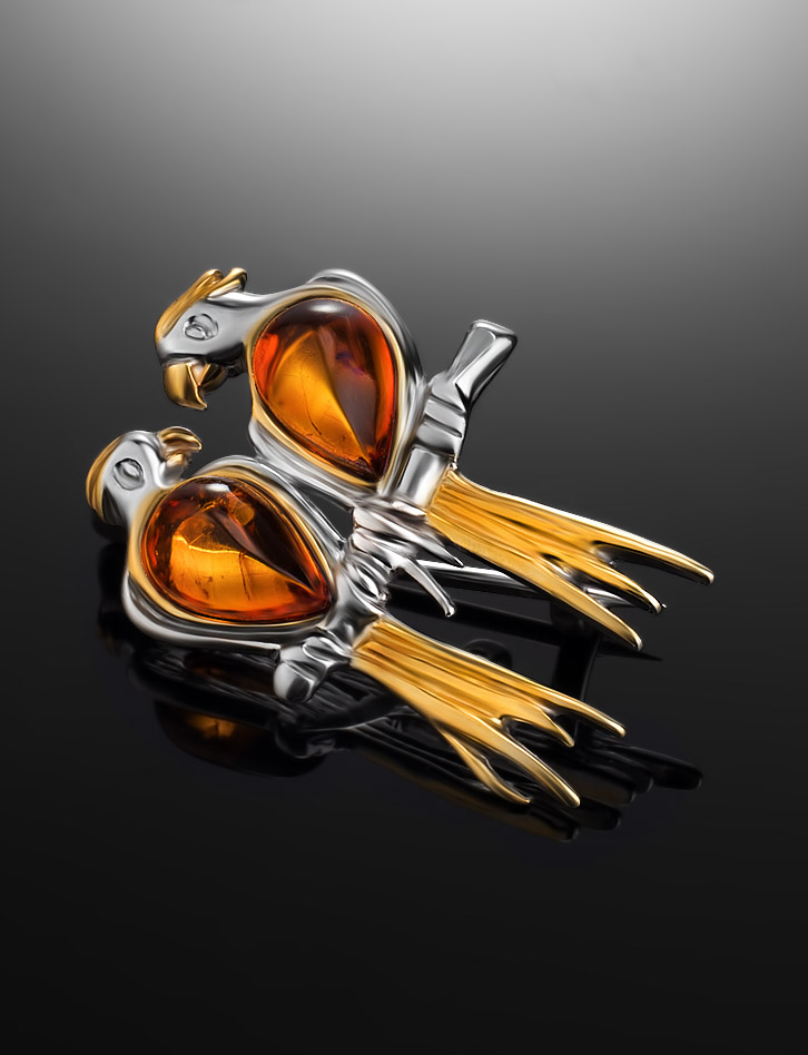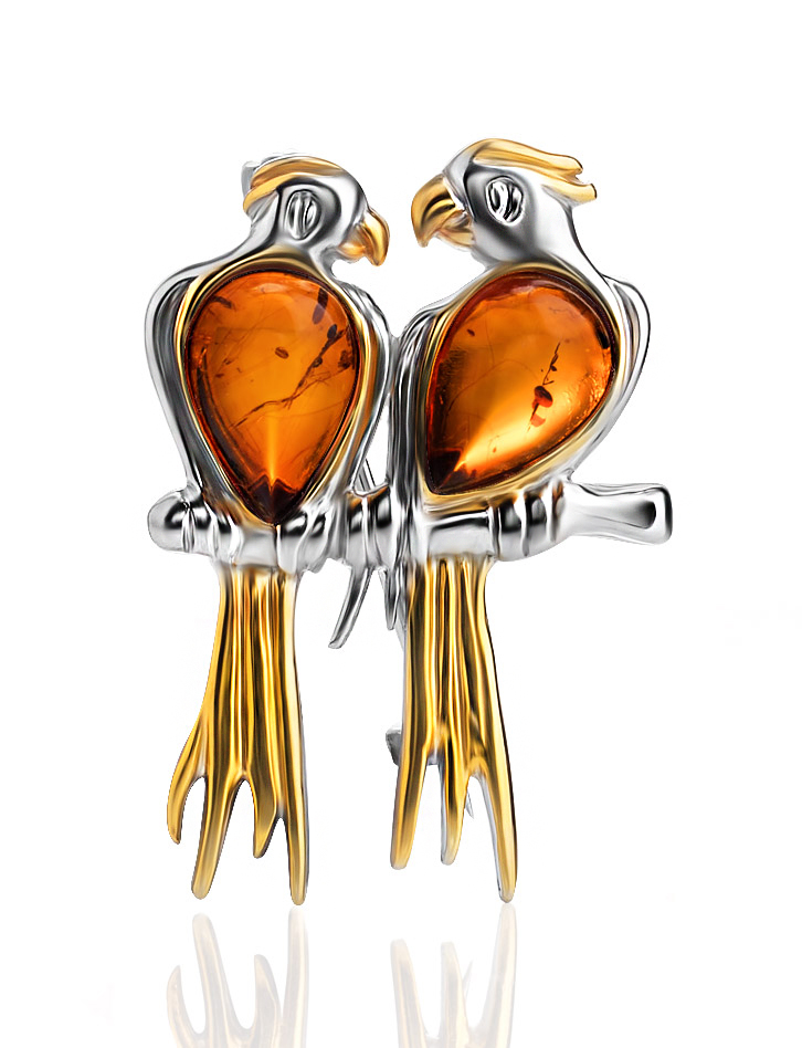 Очаровательная позолоченная брошь, украшенная натуральным янтарём «Попугайчики»