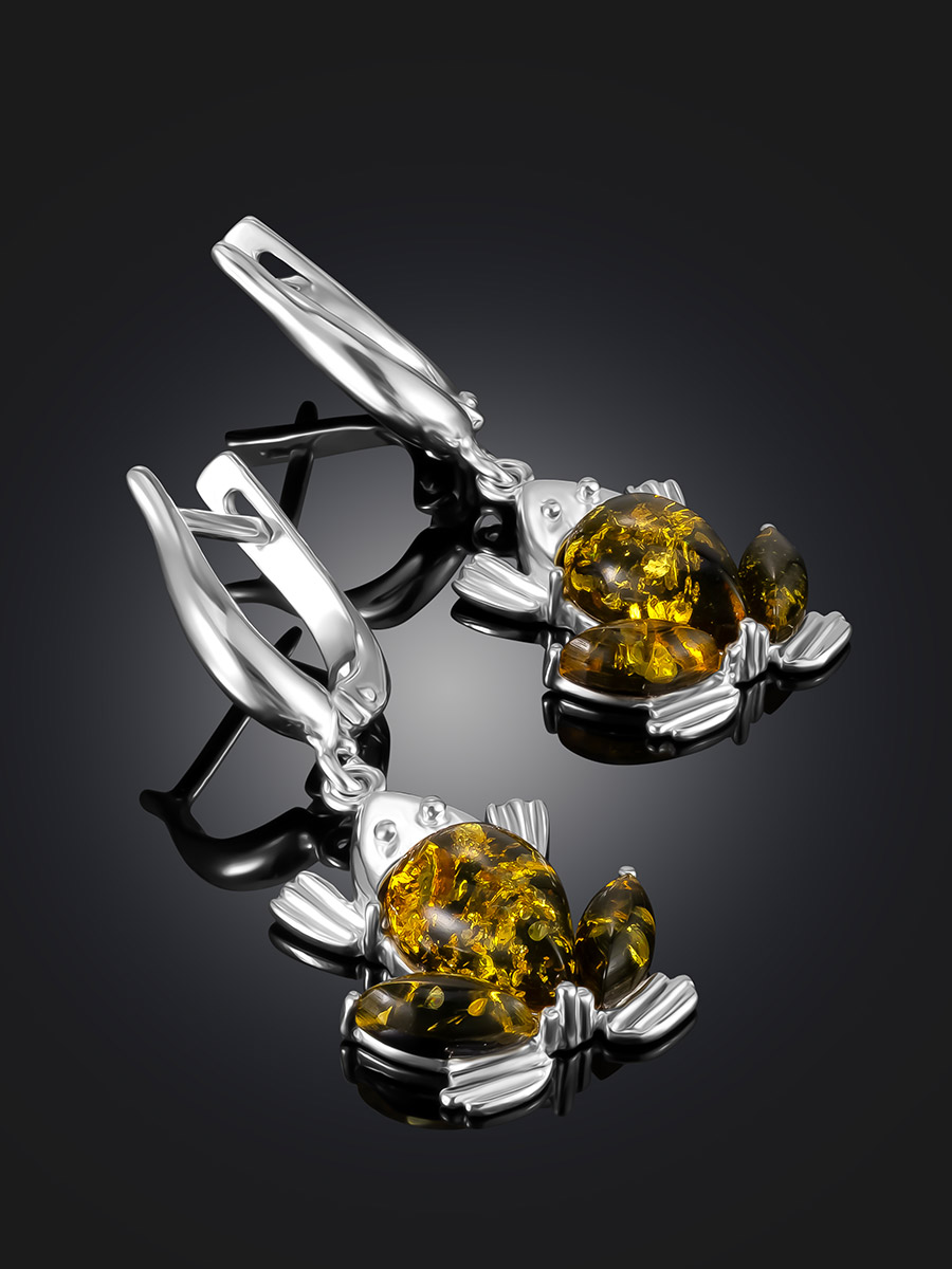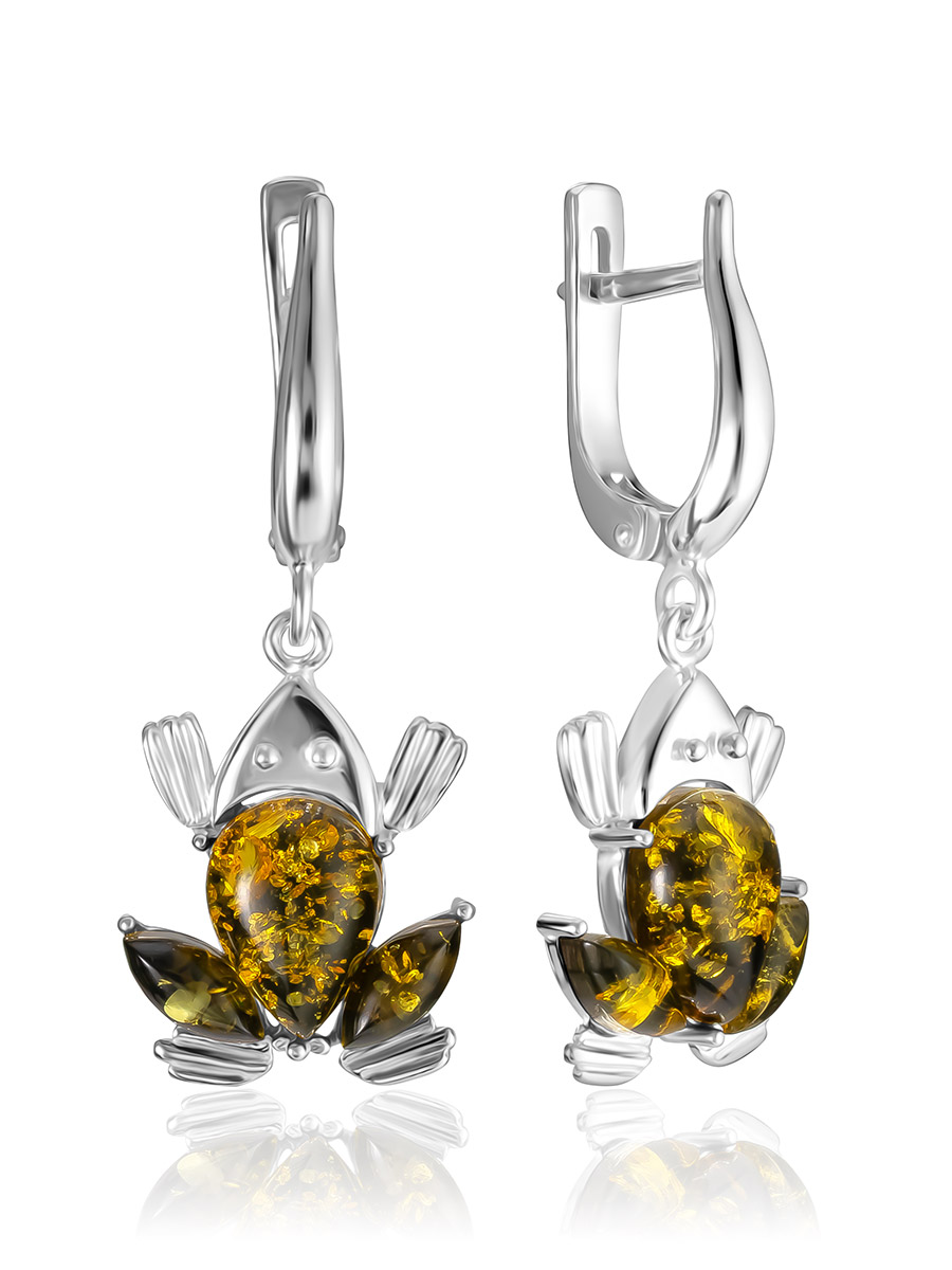 Очаровательные подвесные серьги «Лягушка» с янтарём зелёного цвета