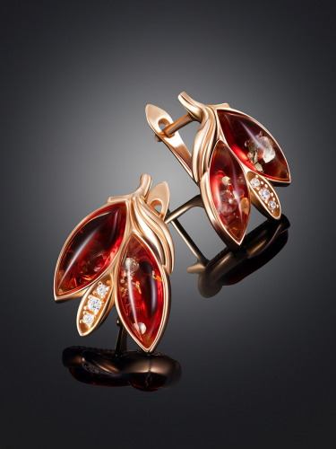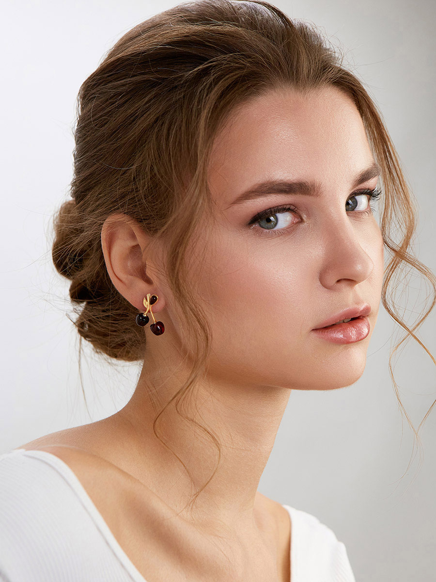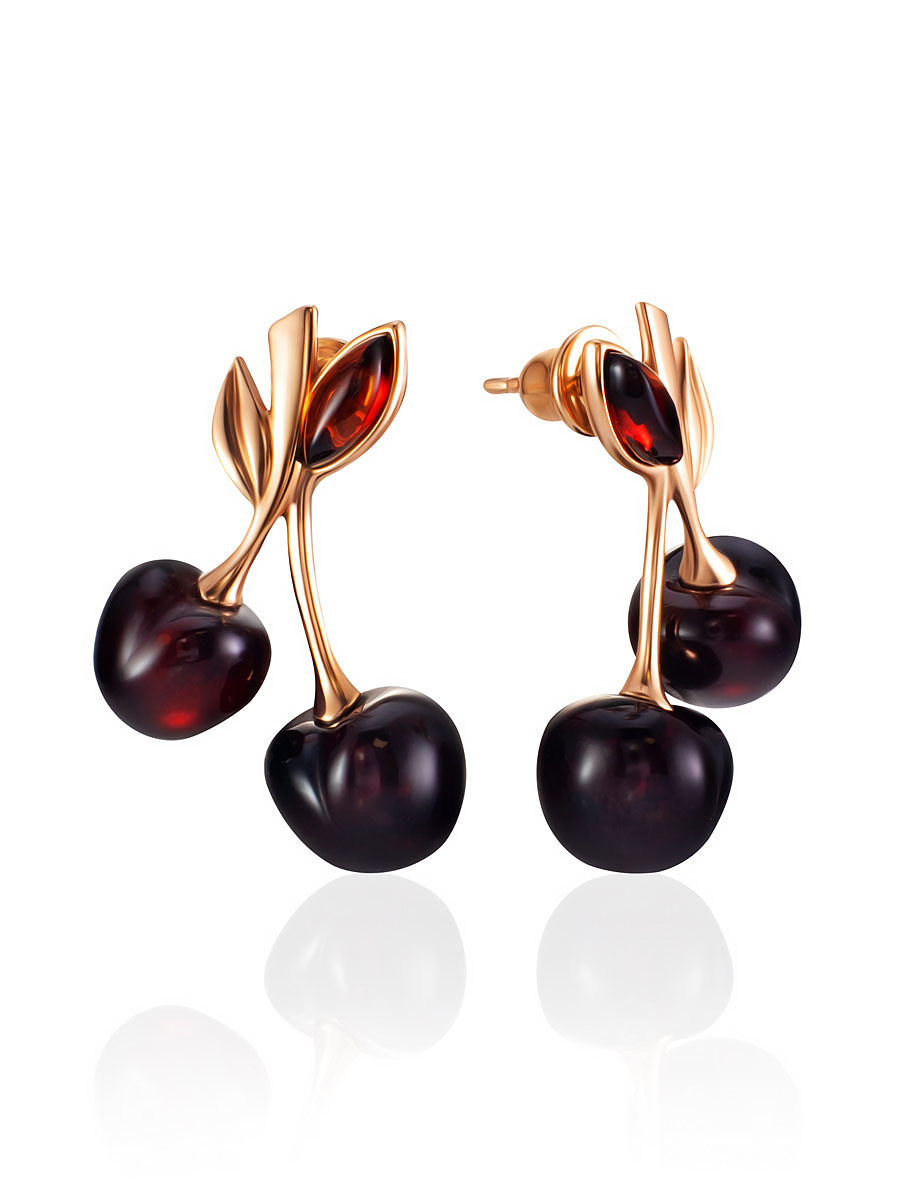 Очаровательные позолоченные серьги-гвоздики «Вишенка» с вишнёвым янтарём