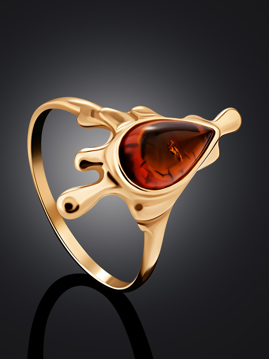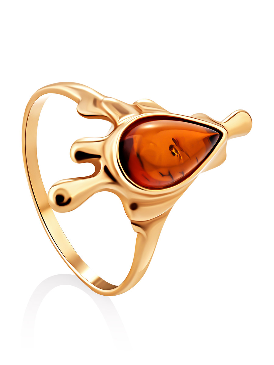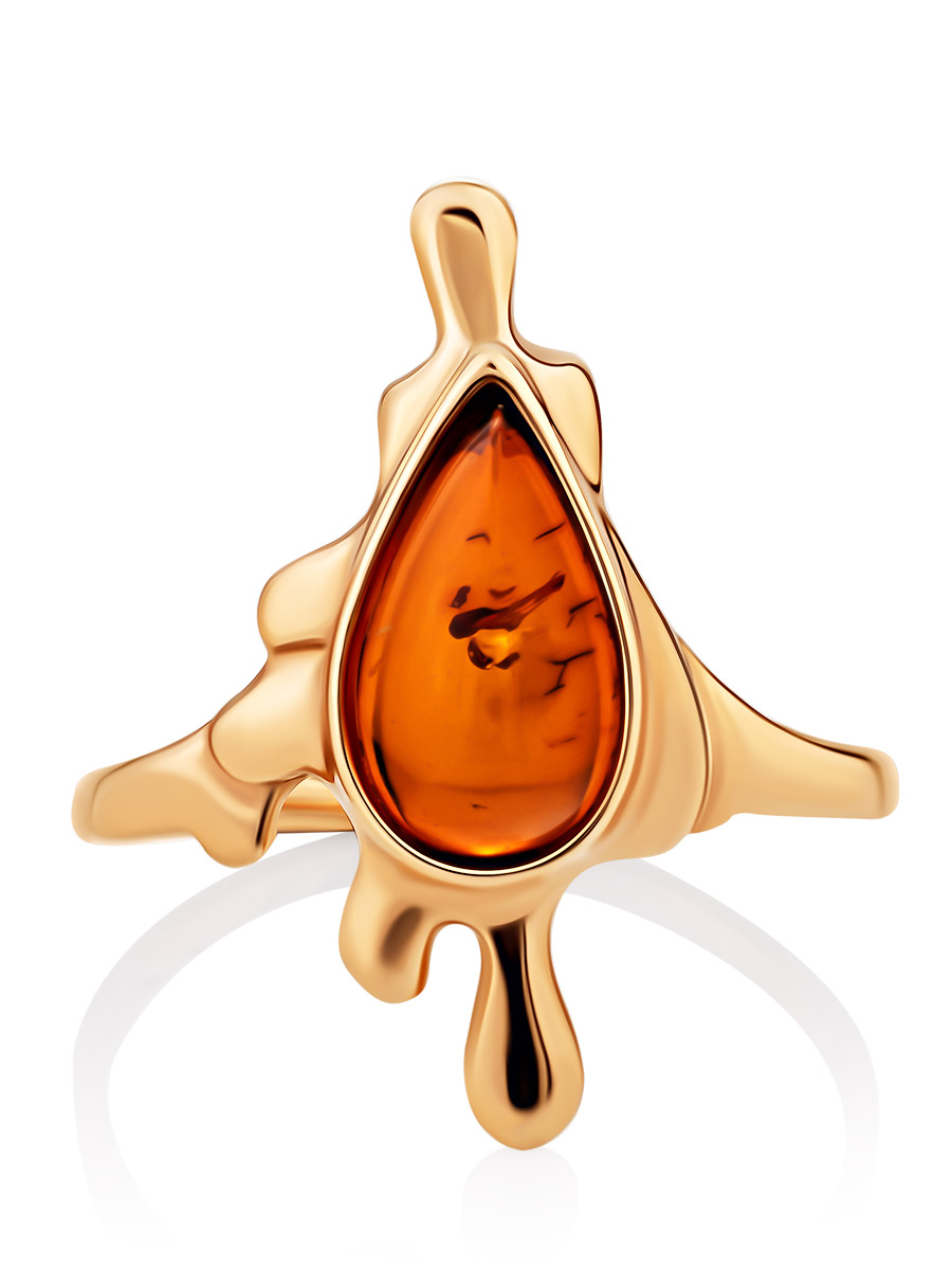 Оригинальное кольцо из позолоченного серебра с янтарём коньячного цвета «Иллюзия»
