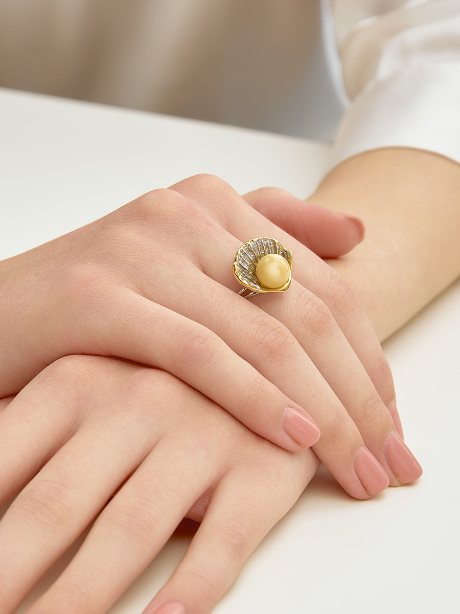 Жемчужина Балтийского моря — тёплая сияющая бусина из натурального балтийского янтаря медового цвета, примостившаяся в изящной раковине из серебра с позолотой — смелый и необычный образ, воплощенный нашими ювелирами. Оригинальное украшение станет изюминкой вашего образа. _x000D_