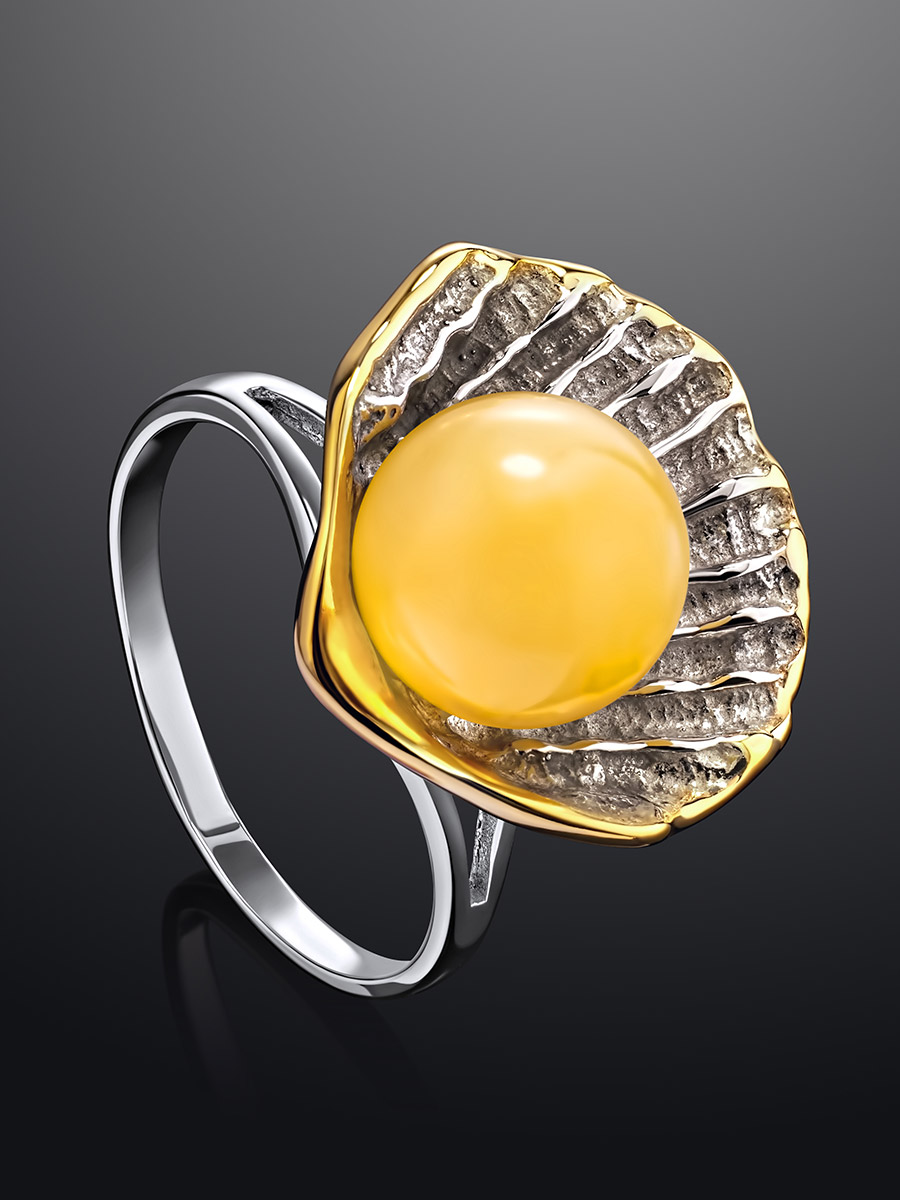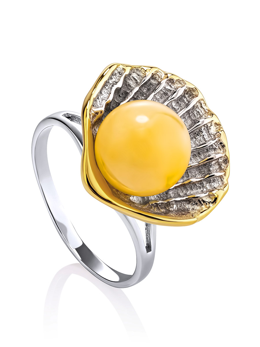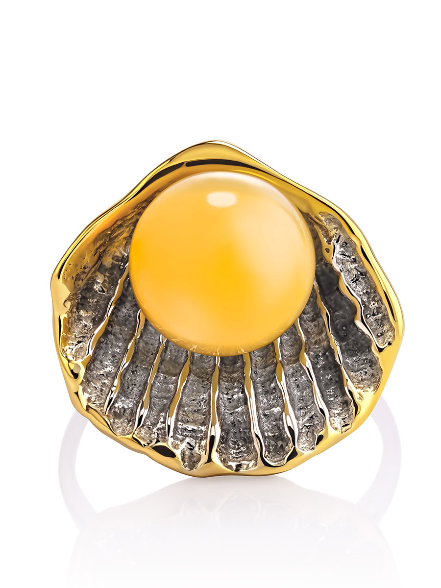 Оригинальное кольцо «Ракушка» с натуральным медовым янтарём