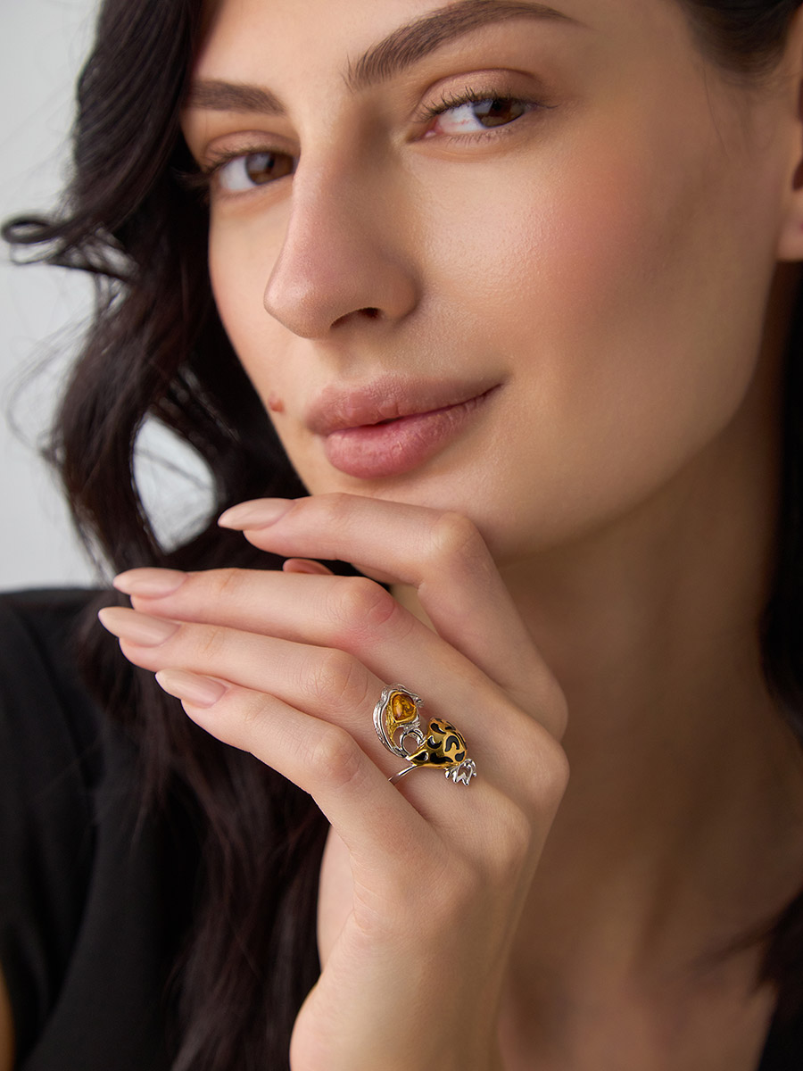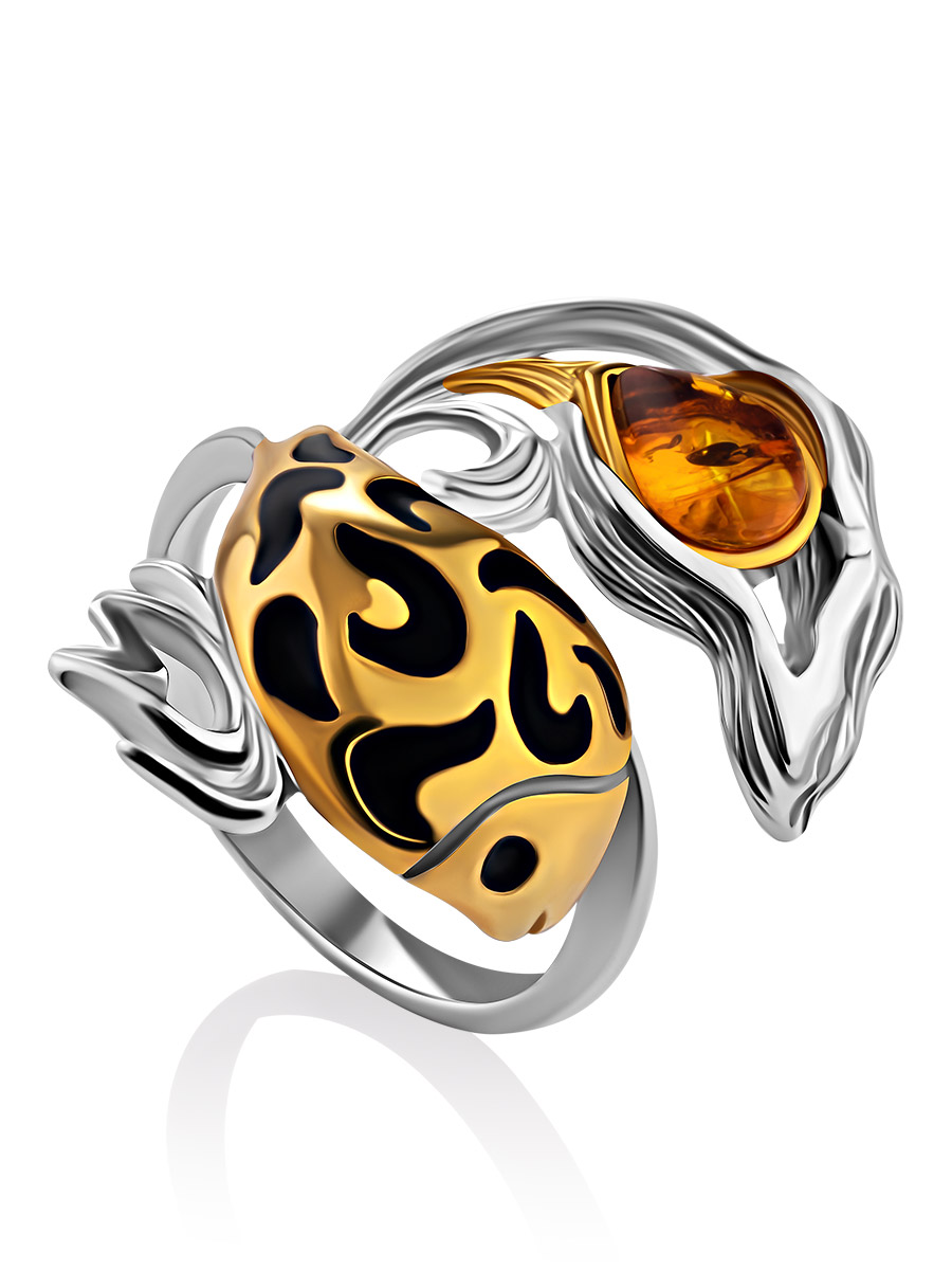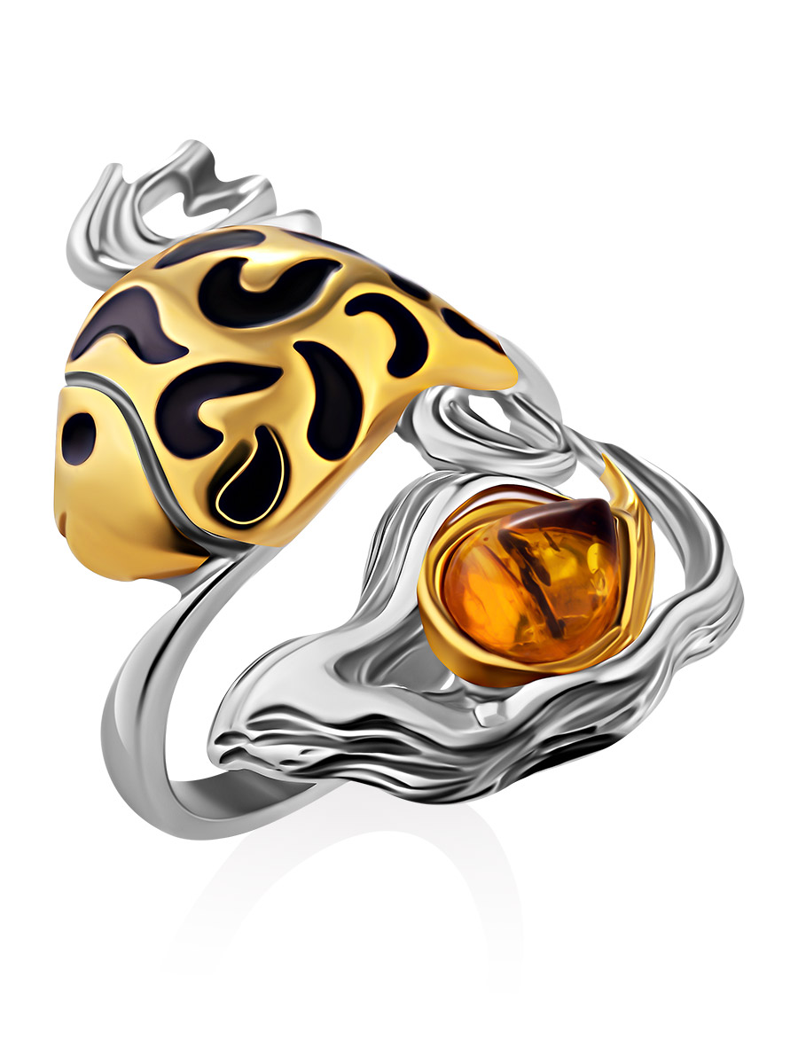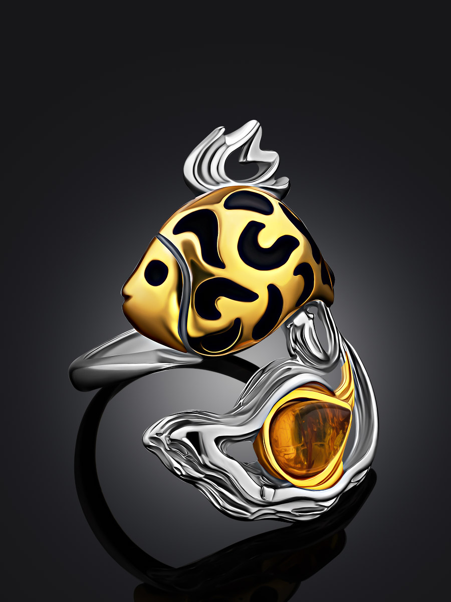 Оригинальное кольцо «Рыбка» из серебра с позолотой и натурального янтаря
