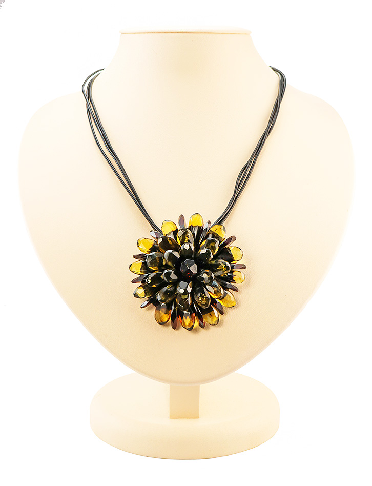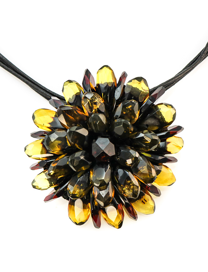 Оригинальное колье «Хризантема алмазная» из натурального балтийского янтаря лимонного и вишнёвого цветов на шнурке