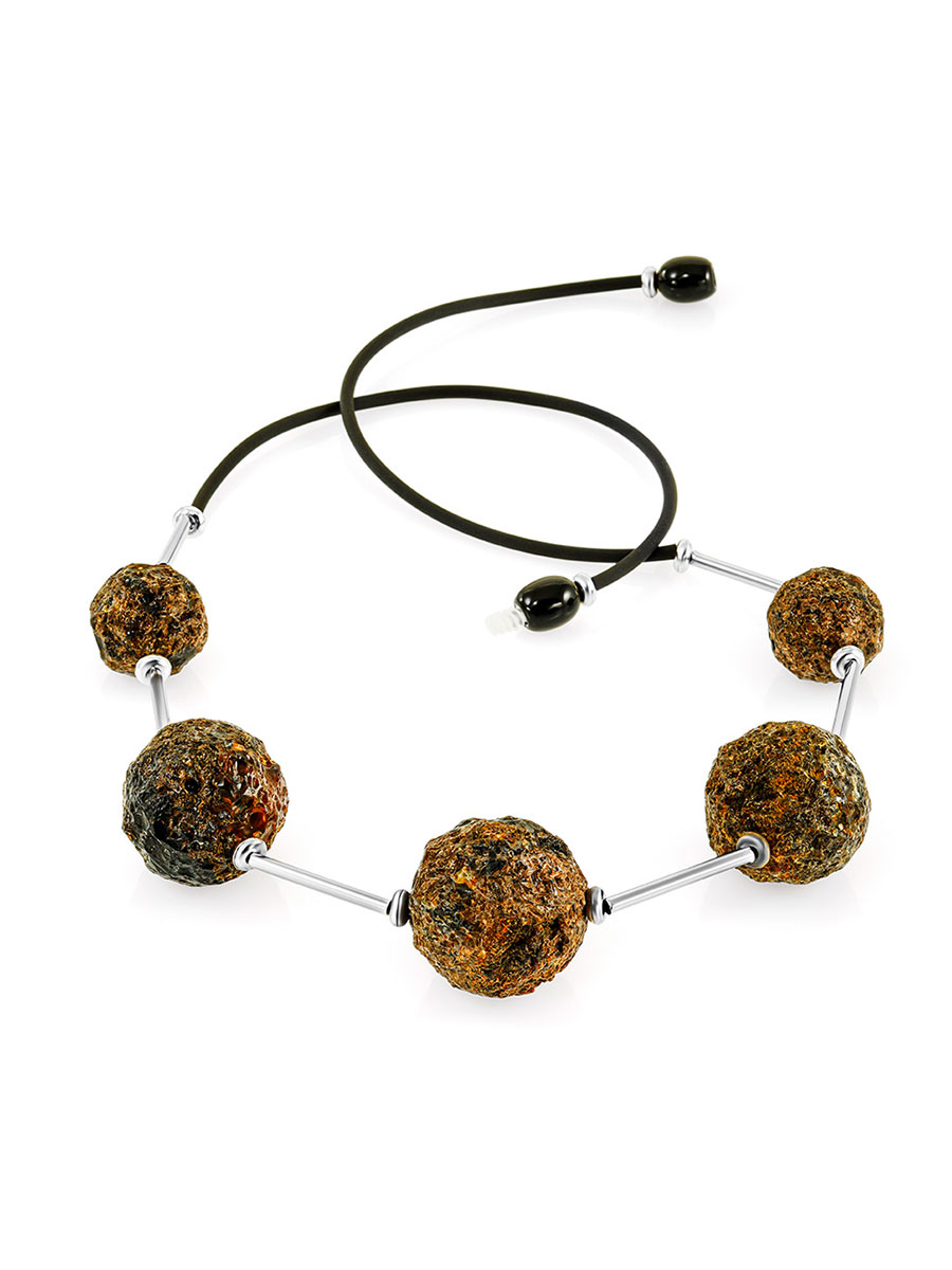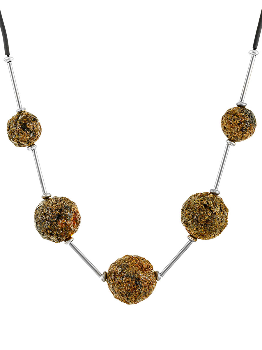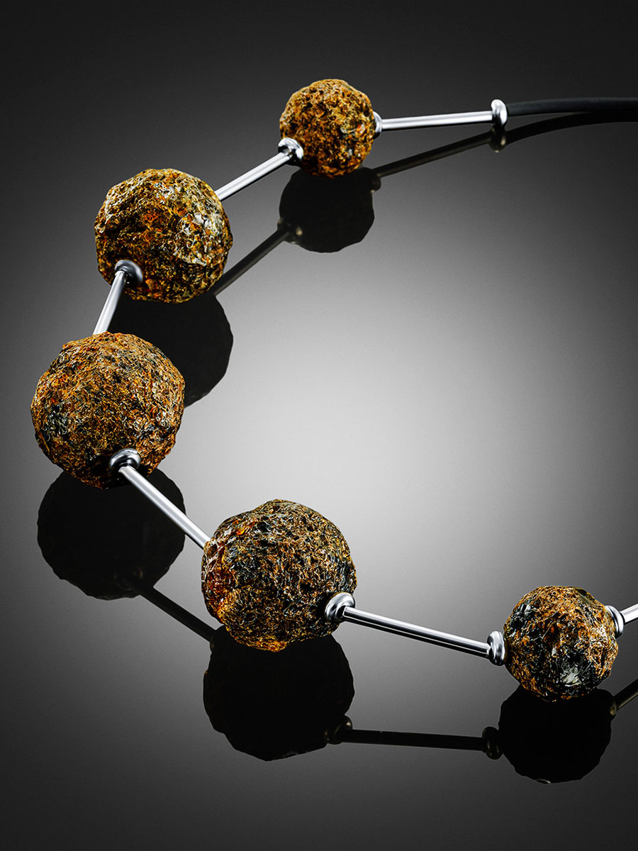 Стильное ожерелье создано из крупных кусаных шаров натурального балтийского янтаря чёрного цвета с пористой текстурой. Необработанная поверхность камня щедро делится со своим владельцем всеми полезными веществами, содержащимся в янтаре, а необычный дизайн делает это украшение ярким и эффектным дополнением к образу. Подробнее о полезных свойствах янтаря можно прочитать здесь._x000D_