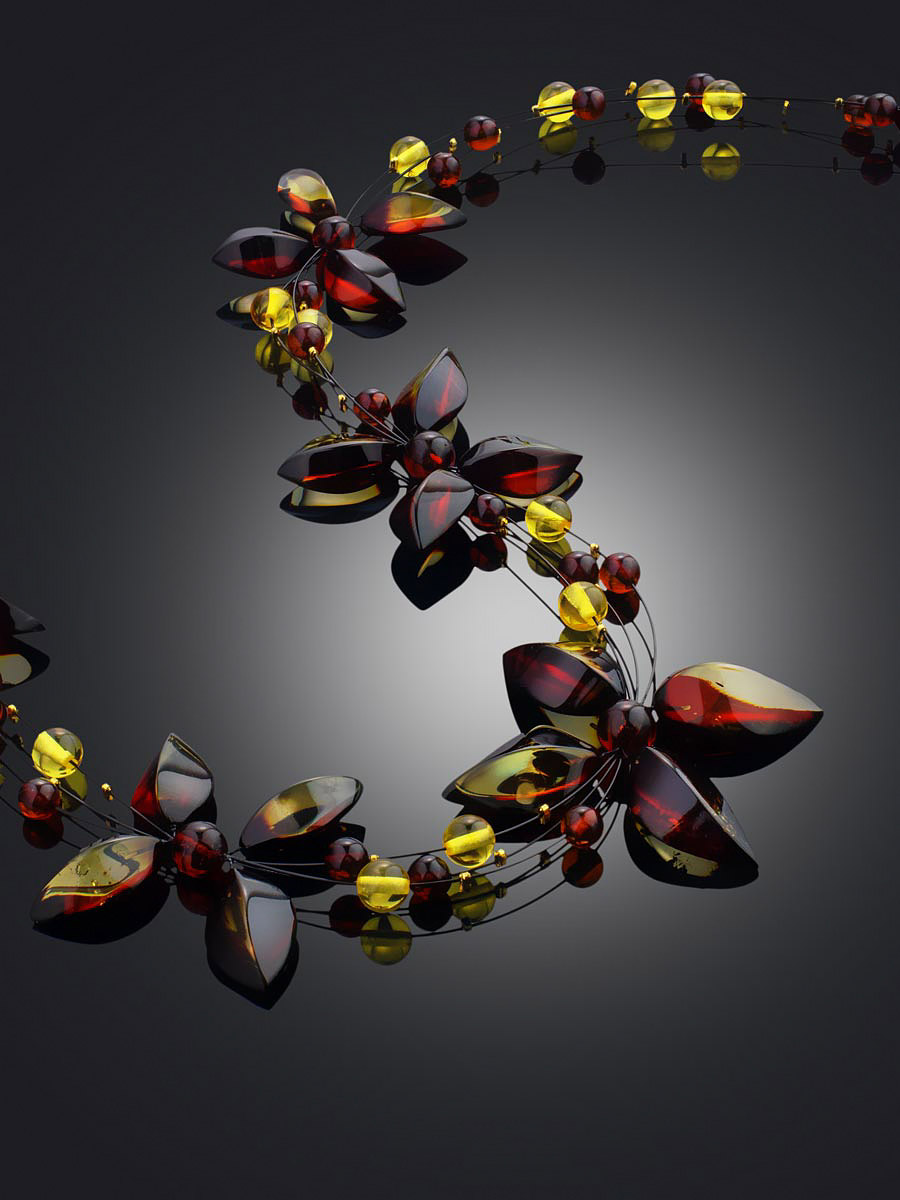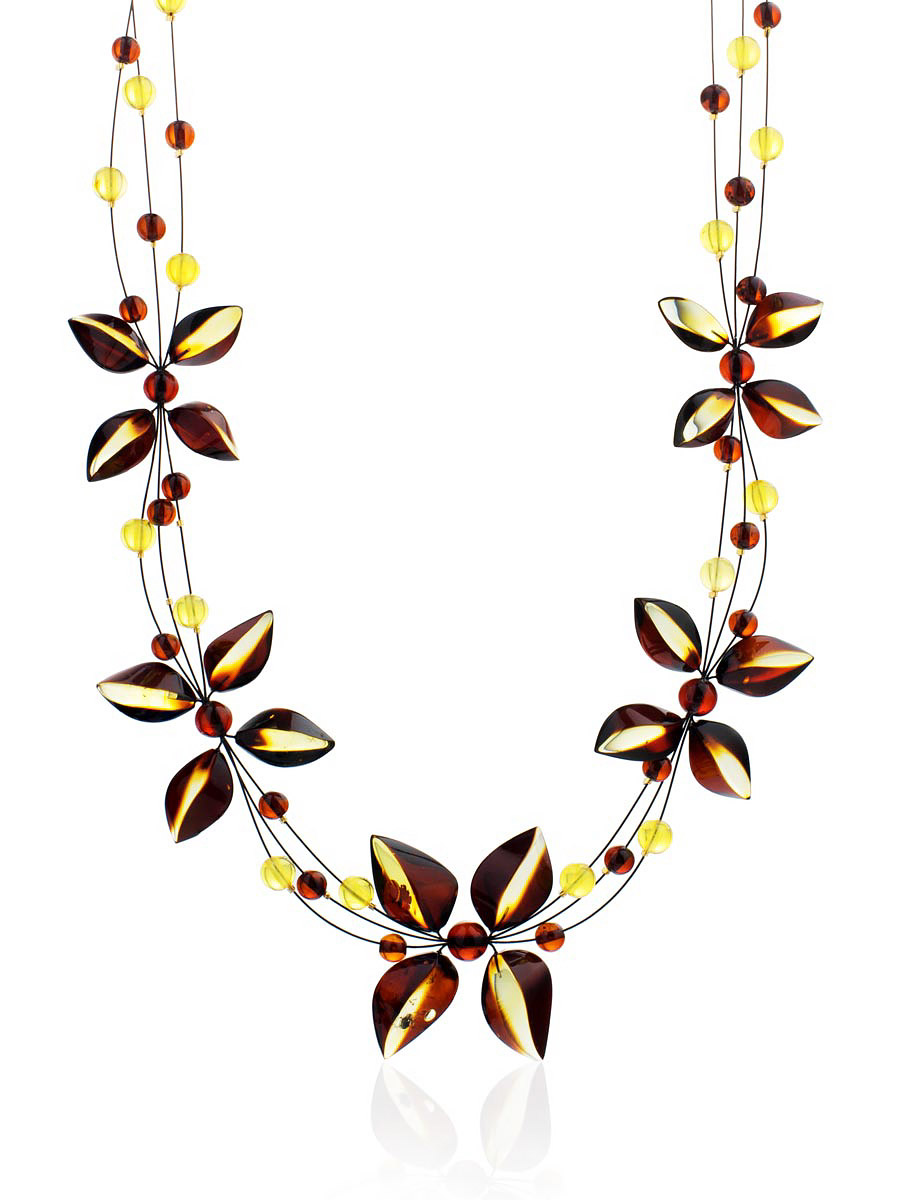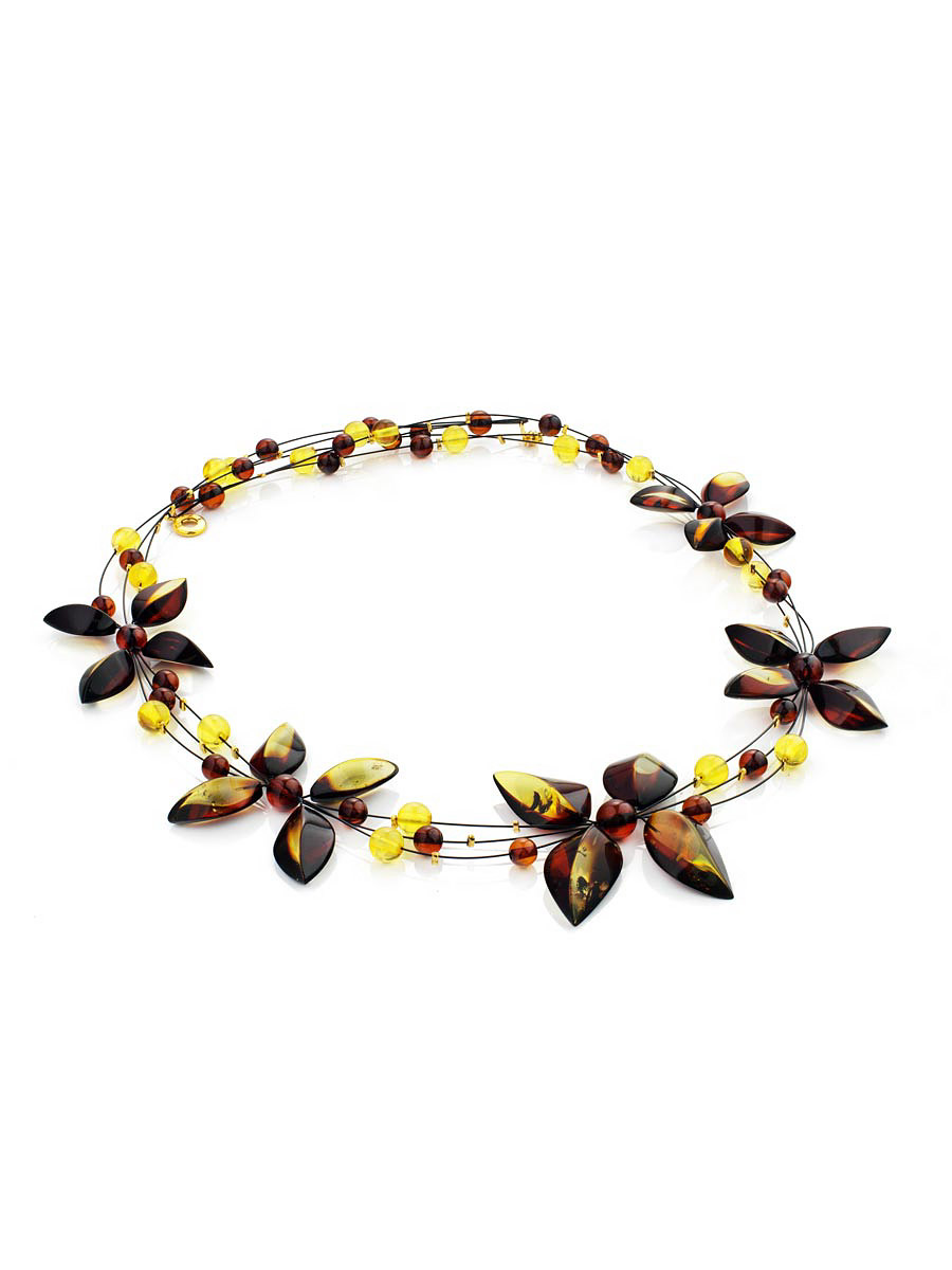 Оригинальное колье из натурального янтаря с необычной тонировкой «Первоцвет» на струне