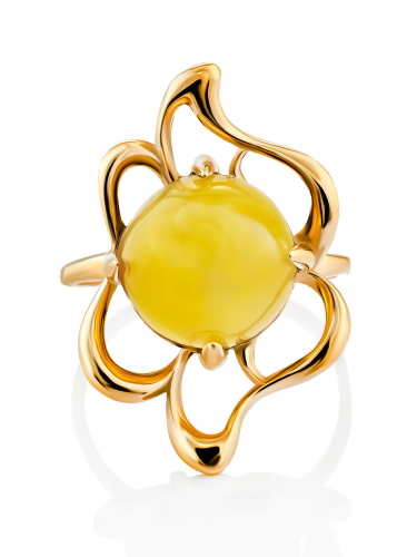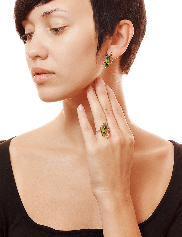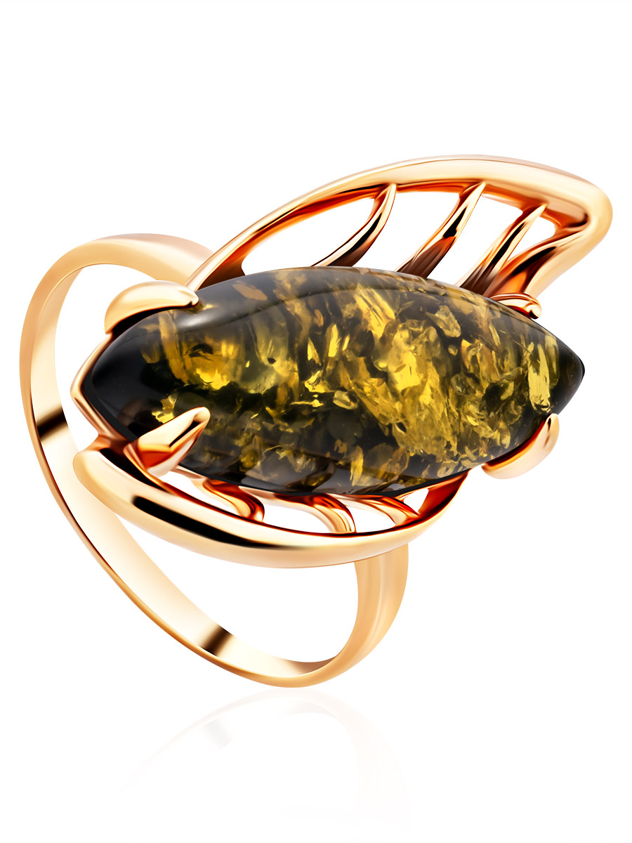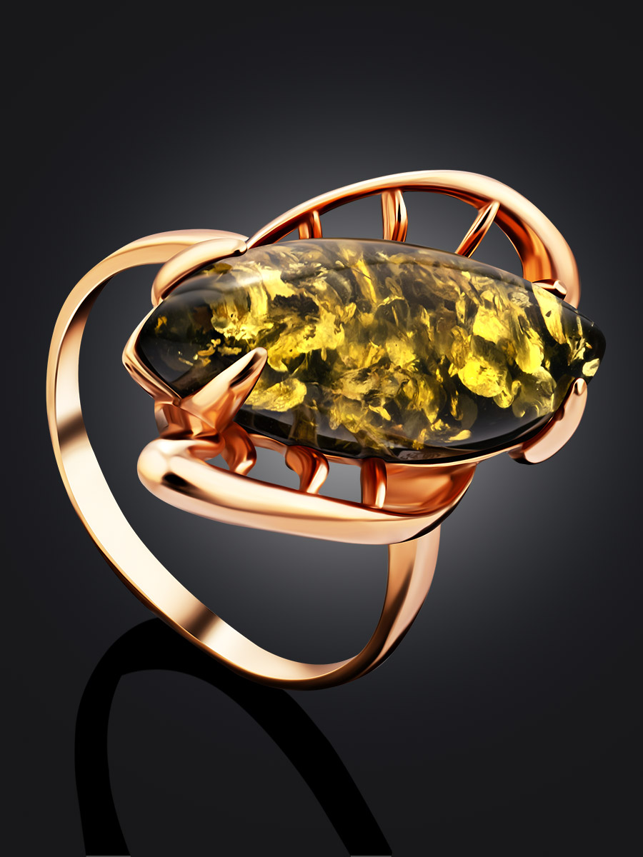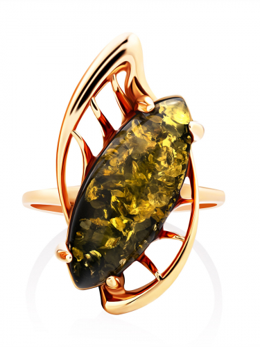 Оригинальное крупное кольцо с зелёным янтарём «Росянка»