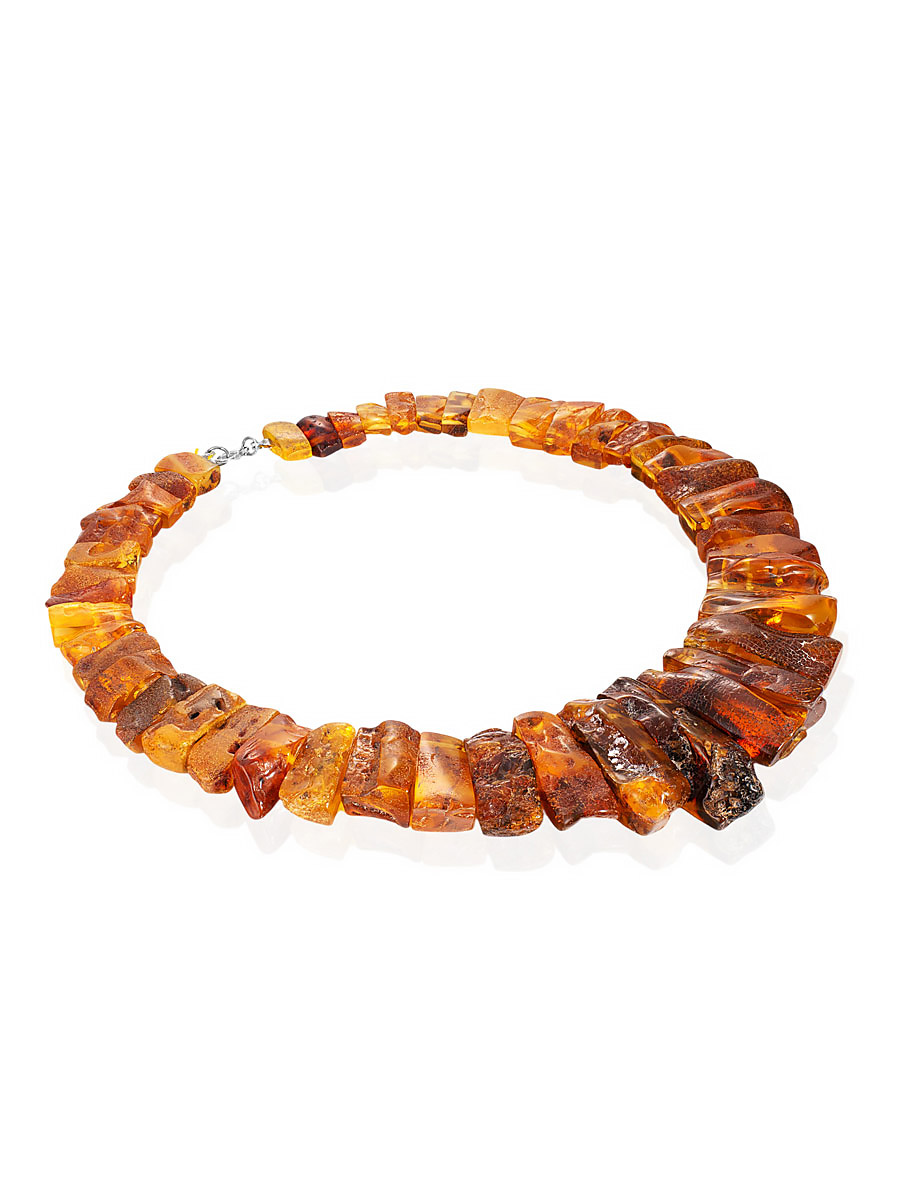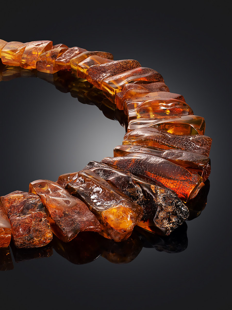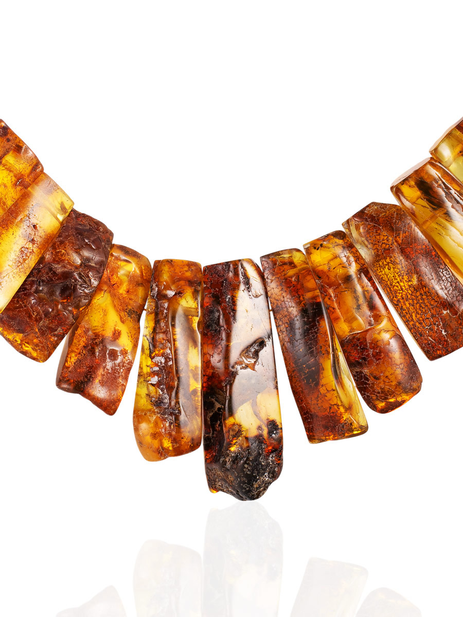 Это крупное эффектное украшение порадует всех любительниц необычных и броских аксессуаров, поклонниц этнического стиля, а также тех, кто ищет в изделиях не только красоту, но и практическую пользу. Созданное из цельного натурального балтийского янтаря с сохранением природной корки, это колье обладает всеми полезными свойствами, которым так славится янтарь. Оно оказывает положительное воздействие на здоровье (подробнее о лечебных свойствах янтаря), а также позитивно влияет на эмоциональное состояние человека. Такое украшение отлично впишется в этнические образы, а самые смелые особы могут надевать его даже к дополнение к вечерним нарядам с открытыми плечами.  _x000D_