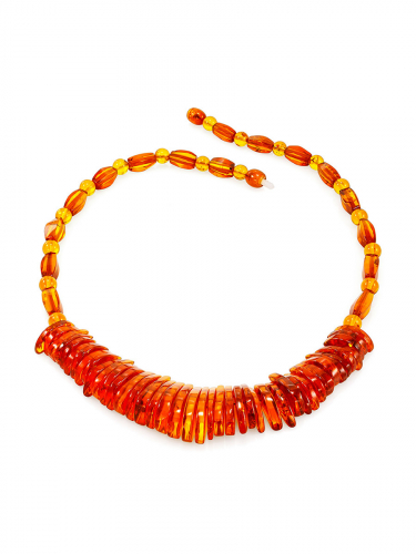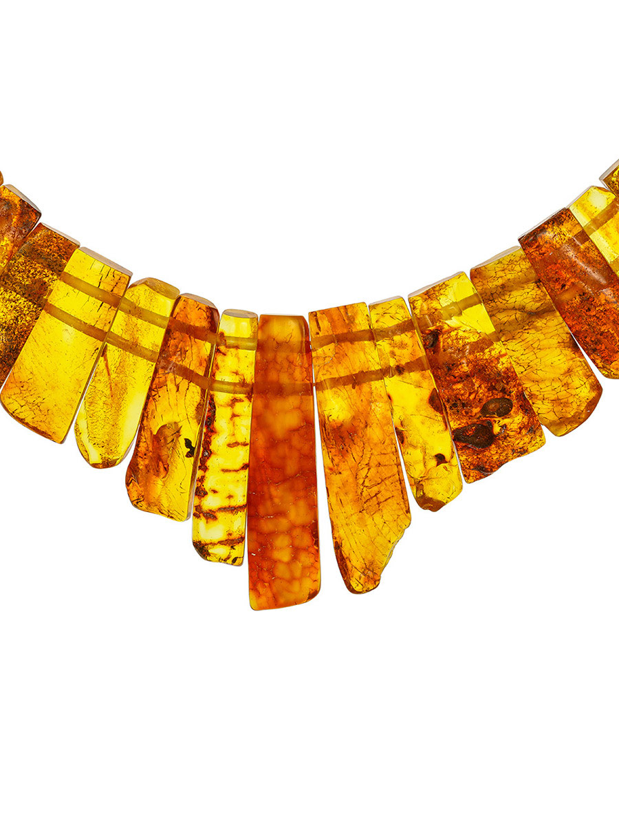 Это сияющее эффектное украшение порадует всех любительниц необычных и броских аксессуаров, поклонниц этнического стиля, а также тех, кто ищет в изделиях не только красоту, но и практическую пользу. Созданное из цельного натурального балтийского янтаря, это колье обладает всеми полезными свойствами, которым так славится янтарь. Оно оказывает положительное воздействие на здоровье (подробнее о лечебных свойствах янтаря), а также позитивно влияет на эмоциональное состояние человека. Такое украшение отлично впишется в этнические образы, а самые смелые особы могут надевать его даже к дополнение к вечерним нарядам с открытыми плечами. _x000D_