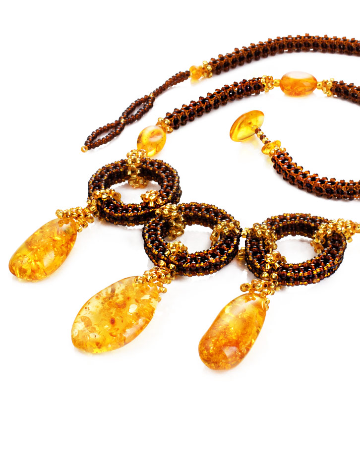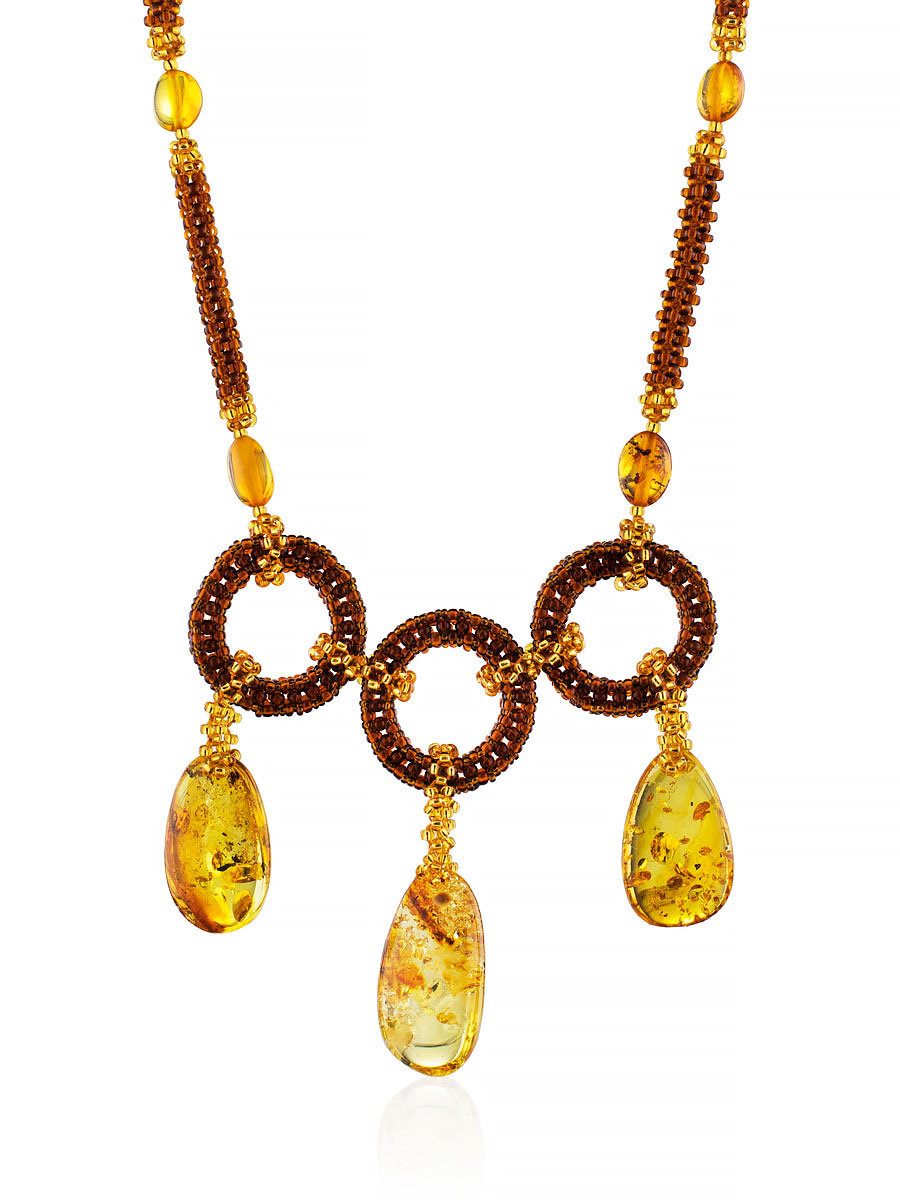 Оригинальное плетёное колье из бисера и натурального янтаря «Лукоморье»
