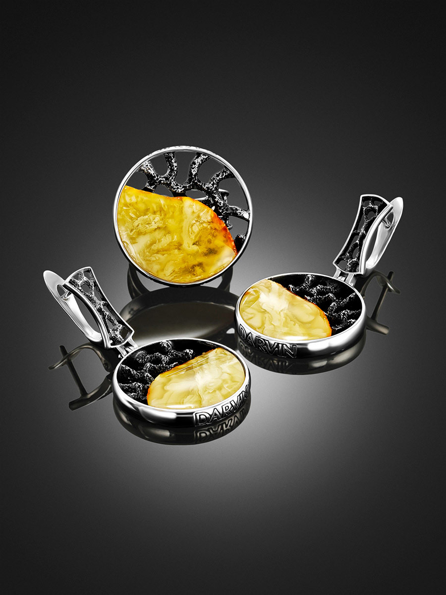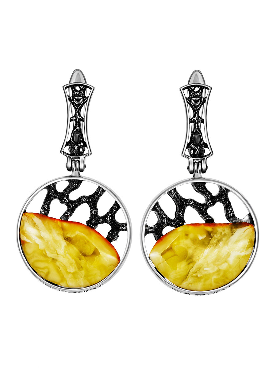 Оригинальные круглые серьги со вставками медового янтаря «Модерн»