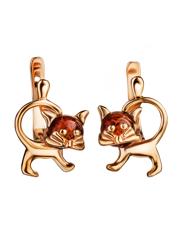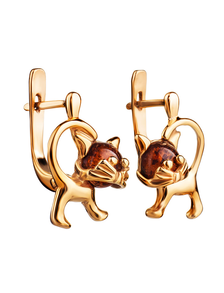 Оригинальные позолоченные серьги «Чешир» с коньячным янтарём