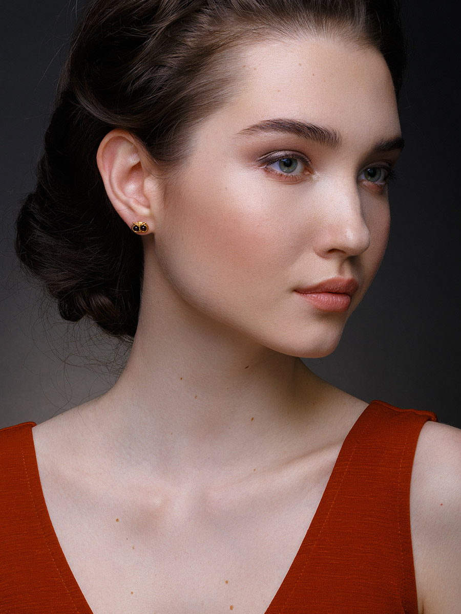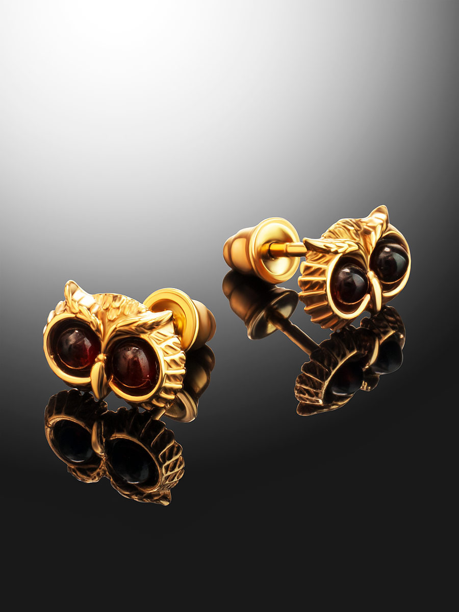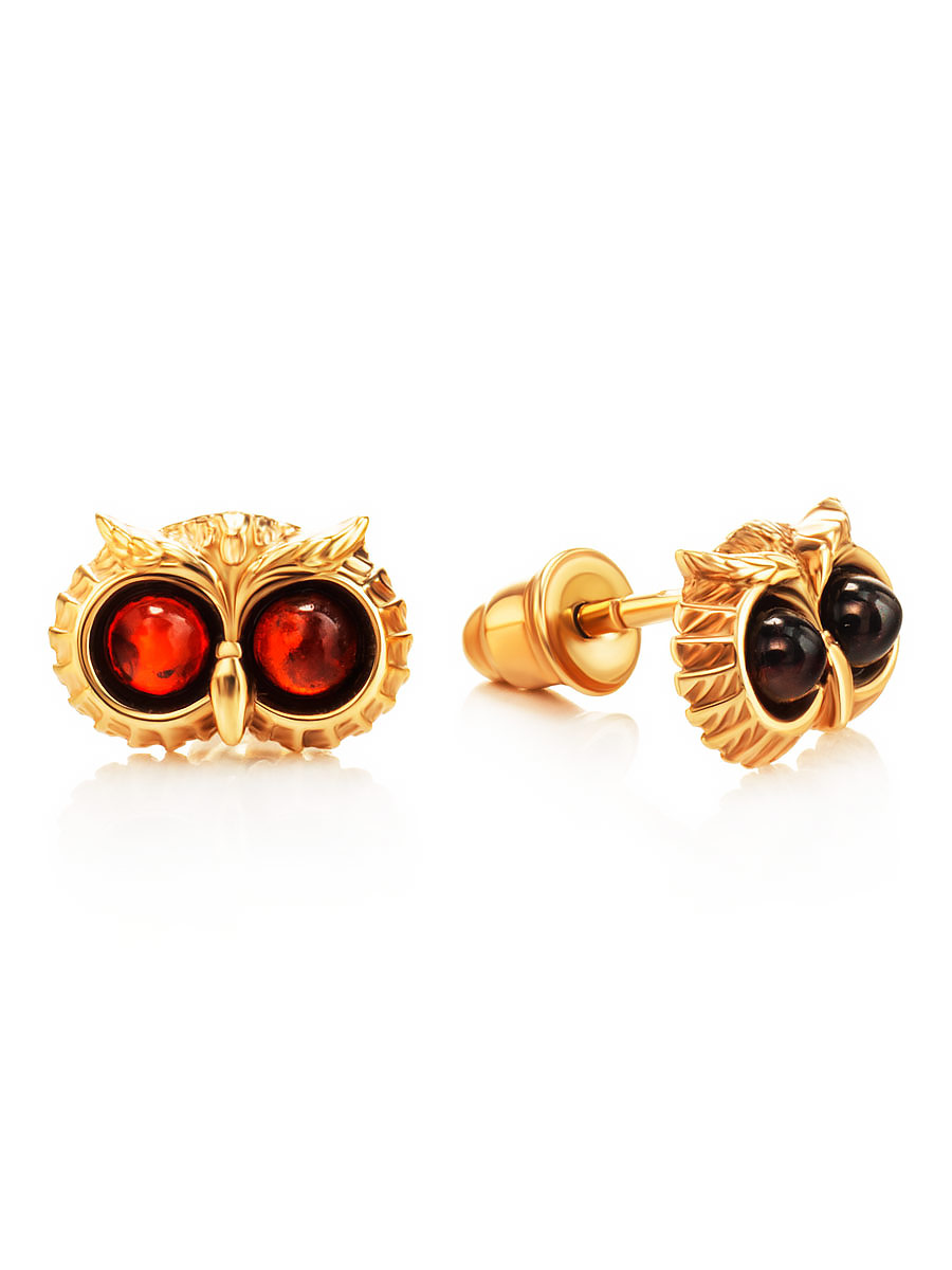 Оригинальные позолоченные серьги из натурального янтаря вишнёвого цвета «Филин»
