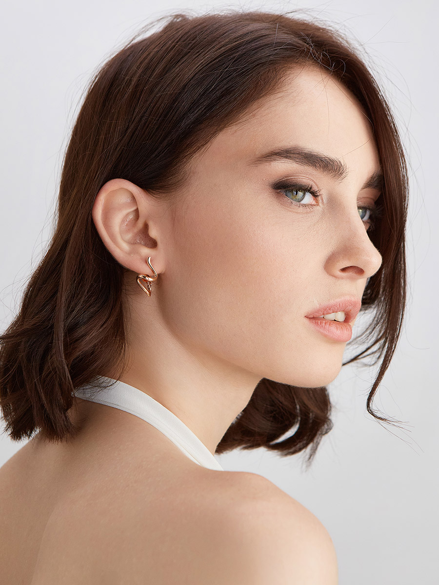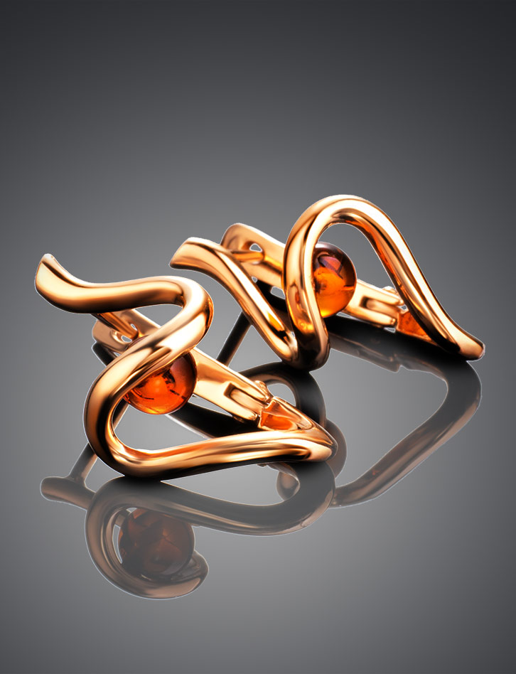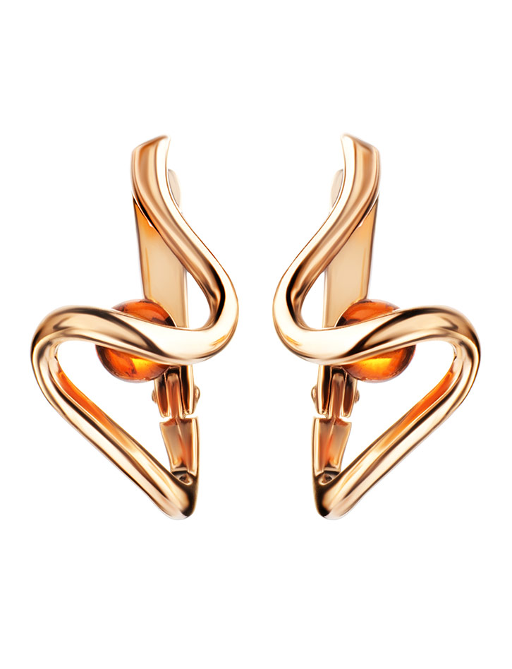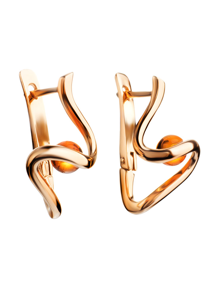 Оригинальные позолоченные серьги с янтарём коньячного цвета «Лея»