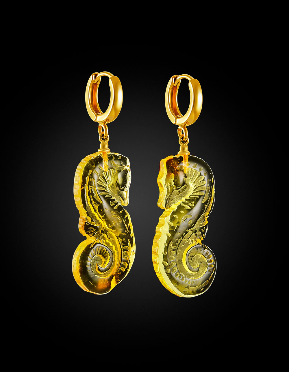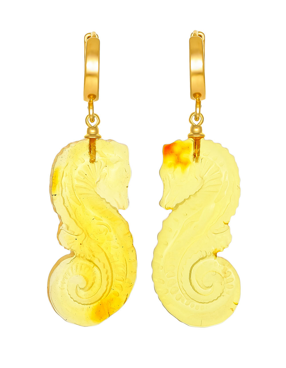 Оригинальные серьги с натуральным янтарём лимонного цвета «Морской конёк»