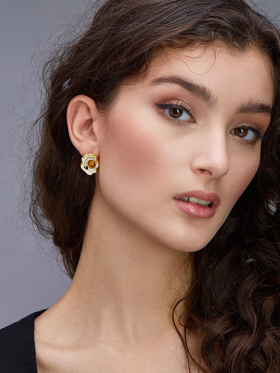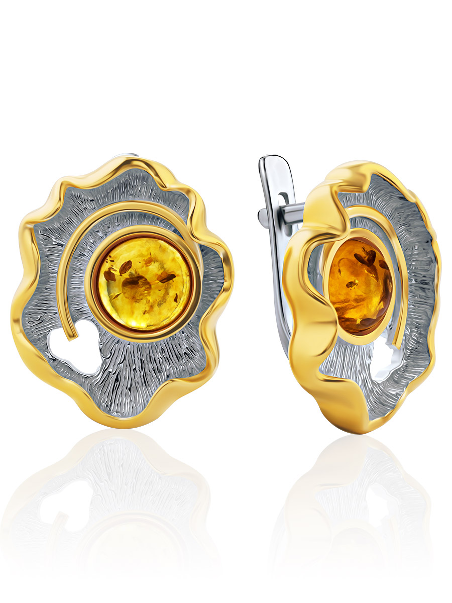 Оригинальные серьги с золотистым янтарём «Маракуйя»