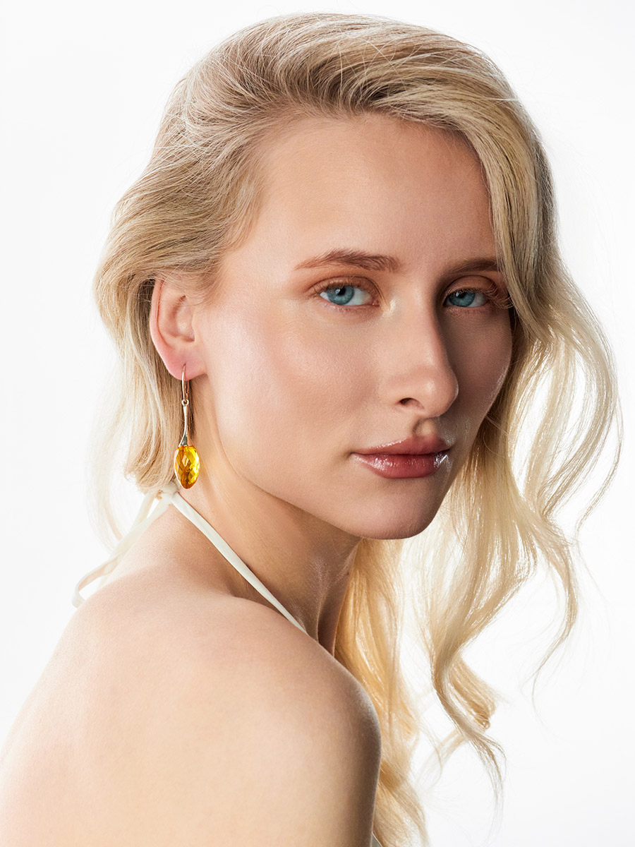 Оригинальные серьги «Свечка» с огранённым янтарём