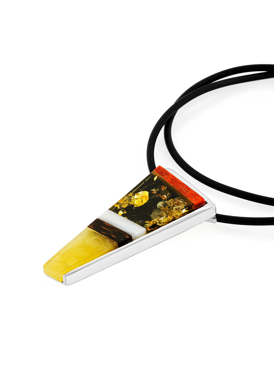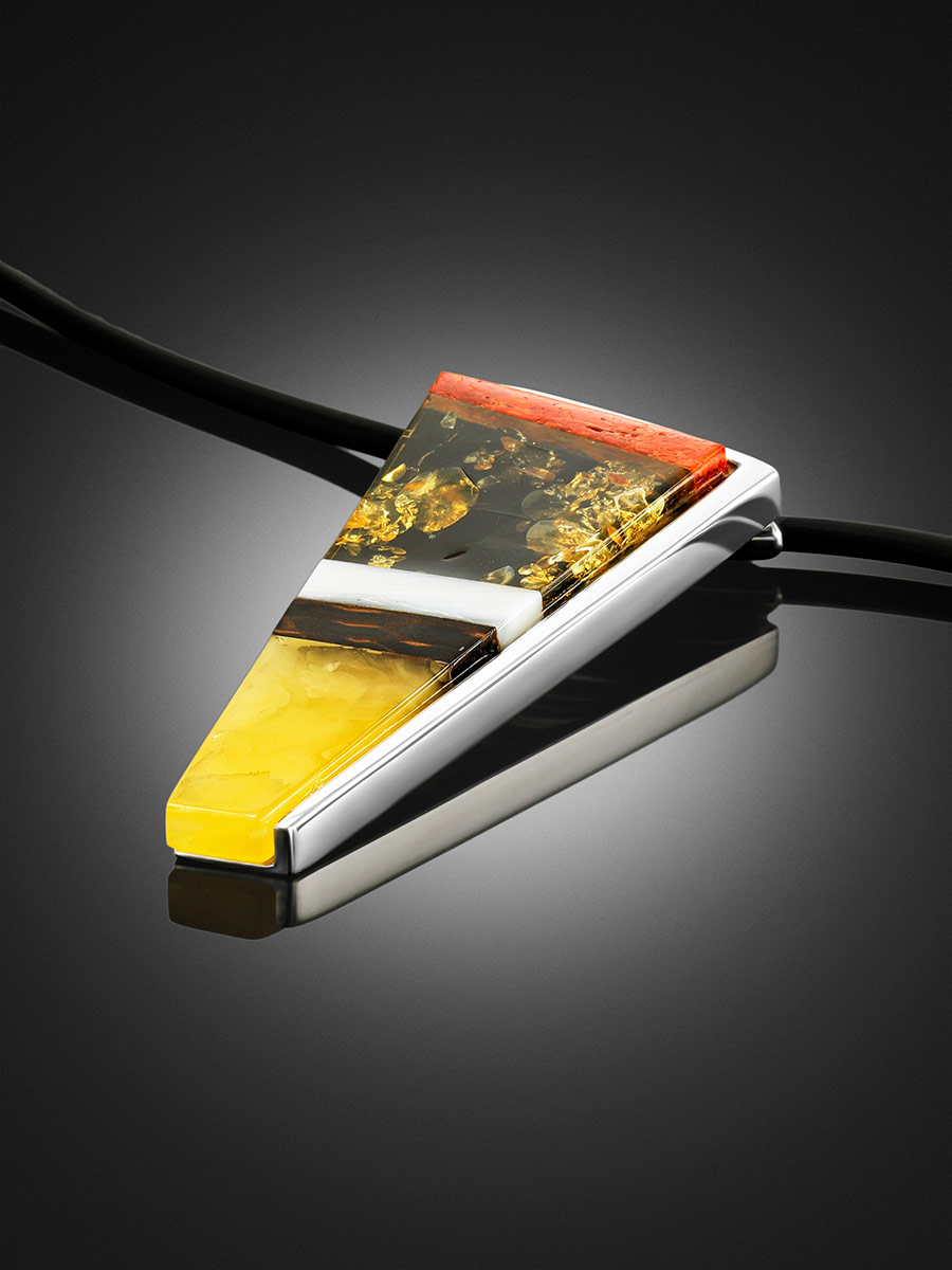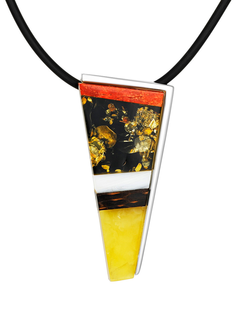 Эта подвеска создана из нескольких кусочков натурального балтийского янтаря разных оттенков, сияющего перламутра, текстурного дерева и серебра. Такое «наслоение» материалов рождает мысли о взаимосвязи всех элементов в природе, о невообразимых пластах истории, в течение которой наша Земля зарождалась, формировалась и видоизменялась. Этот кулон непременно привлечёт к себе внимание, став изюминкой любого выбранного вами образа. _x000D_