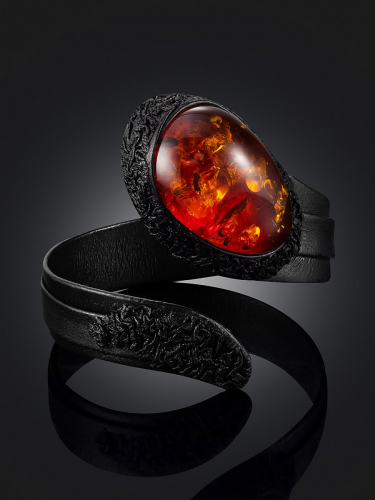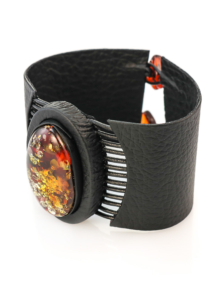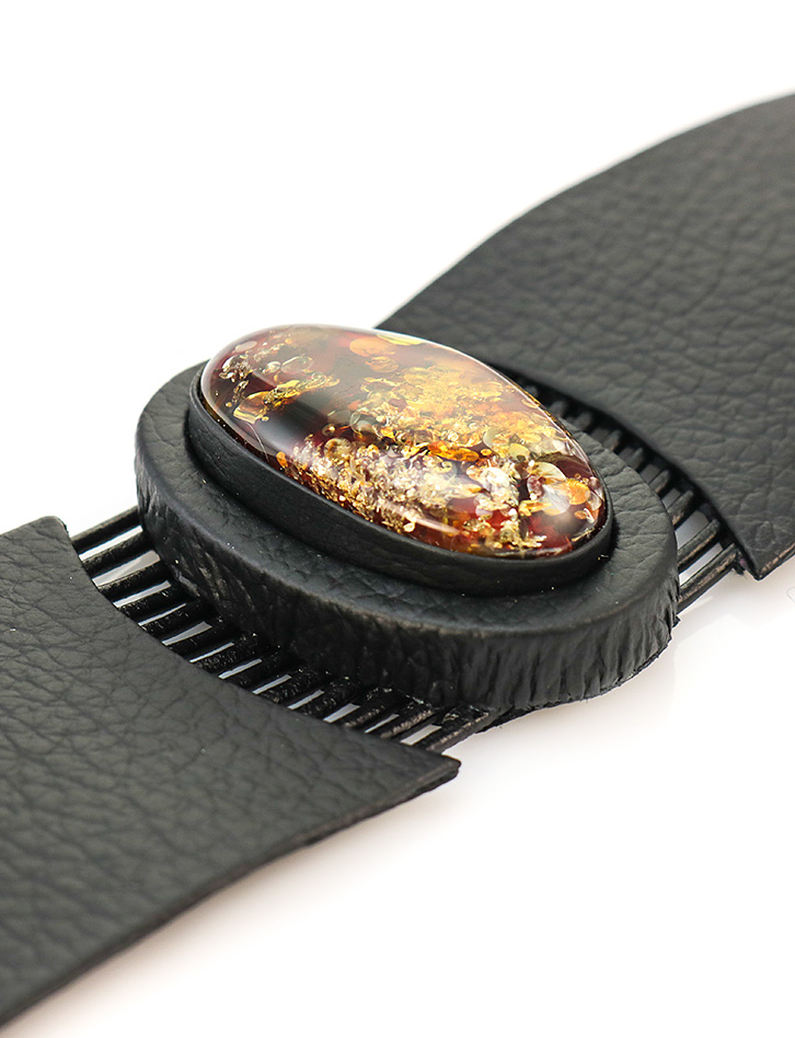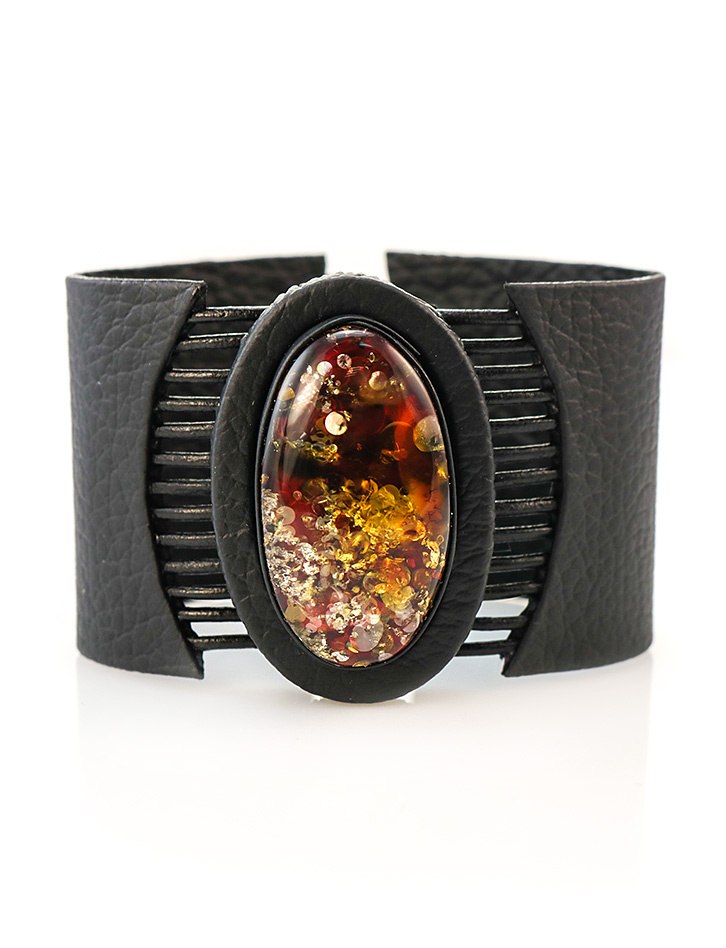 Оригинальный широкий браслет из натуральной кожи с овальной вставкой из сверкающего янтаря «Амазонка»