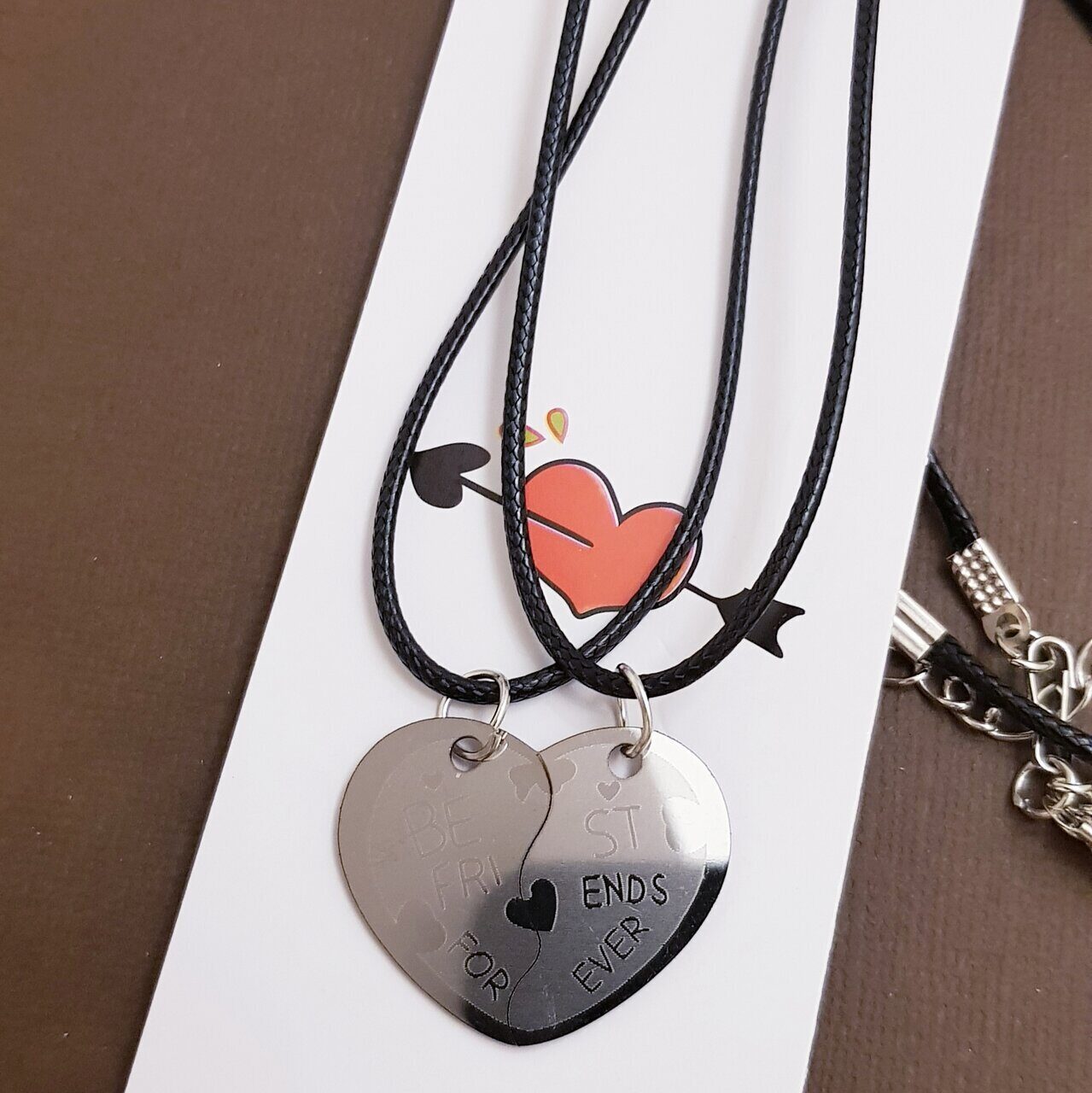 Описание Это милый и романтичный подарок родному человеку на День рождения, Новый год, 14 февраля, 8 марта или годовщину, который сделает вас еще ближе и всегда будет дарить теплые воспоминания. Такой аксессуар - это не только модное украшение, но и символ искренних чувств. Длина шнурка: 41-43 см. Дополнительная цепочка: 4,5 см. Размер кулонов: 2,3*1,5 см. (размеры кулонов могут отличаться на несколько мм.) Материал: металл, экокожа. Вес: 12 гр.