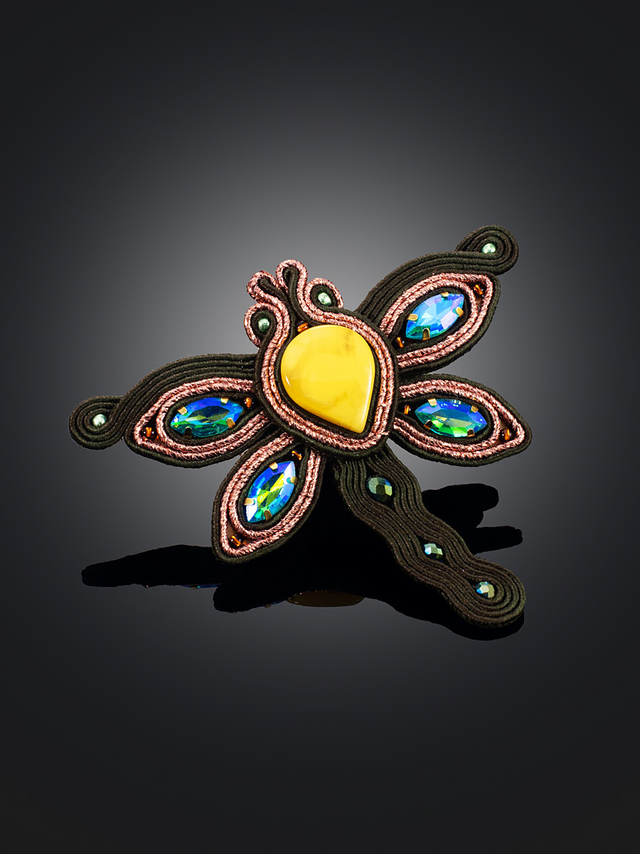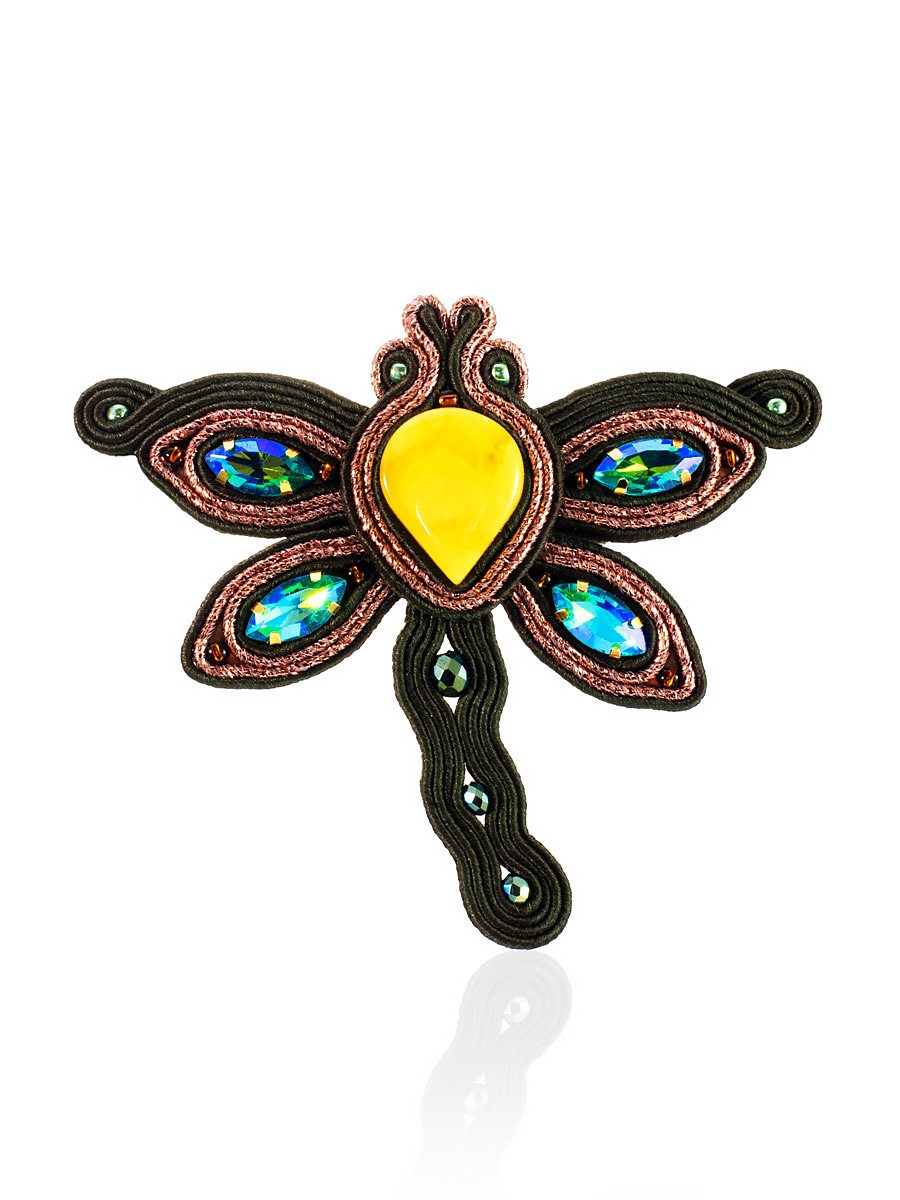 Плетёная брошь-стрекоза с натуральным янтарём медового цвета «Индия»